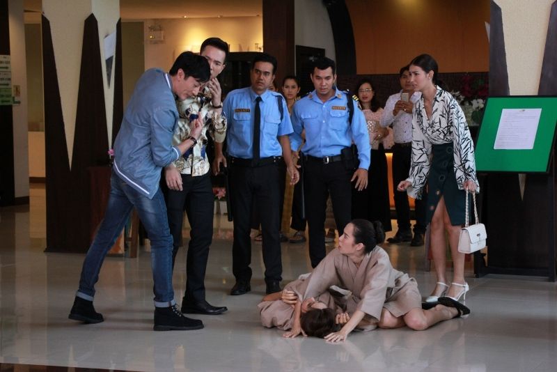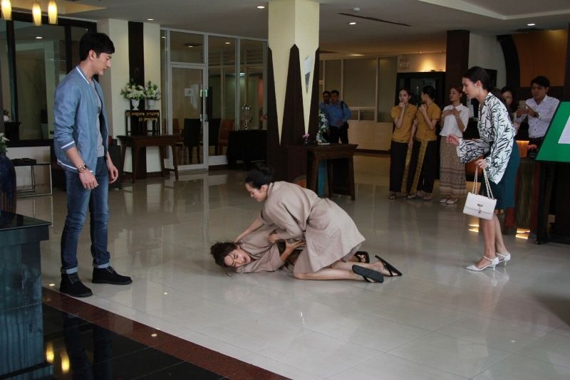 ฉากนี้ ถ่ายที่ บางกอกเนเชอรัล สปาร์แอนด์รีสอร์ท ฉากนี้รวมนักแสดงเยอะ ยิ่งกว่าจับปูใส่กระด้ง แถมเป็นฉากที่ต้องถกเถียงกัน ผู้กำกับเลยย้ำ เรื่องบทและจังหวะการพูดให้แม่น เพราะกลัวนกกระจอกแตกรัง กว่าจะซ้อมฉากนี้เสร็จ ผู้กำกับมีมึนเบาๆ ถ่ายจริง บอยยืนอวดสปาตัวเองให้กับยีนและน้ำตาลฟัง ฟิล์ม กฤตฎ์เห็น รีบมาขัดจังหวะ บอยออกท่าหวงก้างยีน ฟิล์มหมั่นไส้เลยกระชากบอยมาต่อยจนร่วงลงไปกอง แล้วดึงแขนยีนให้เดินตามมา จากนั้นถึงคิว มะลิ ฝ้าย ตามมาสมทบ เห็นฟิล์มกับยีนจับมือกัน ทั้งคู่ถกเถียงกันจะแย่งฟิล์ม แต่สุดท้ายก็รวมหัวกันมารุมยีน ฝ้ายเห็นมะลิกำลังของขึ้น ก็ยุงส่งให้ตบยีนซะเลย มะลิง้างมือยังไม่ทันจะได้ตบ ยีนสุดทนชกหมัดสวนกลับ มะลิร่วงไปกอง โวยวาย ออดอ้อนฟิล์มชุดใหญ่ ยีนเลยขยี้ซ้ำเรื่องฟิล์ม ทำเอาฝ้ายหัวร้อน เพราะเห็นมะลิเกาะแกะไม่ห่าง สุดท้าย มะลิ ฝ้าย ก็หันมาเปิดศึกตบกับชุลมุน