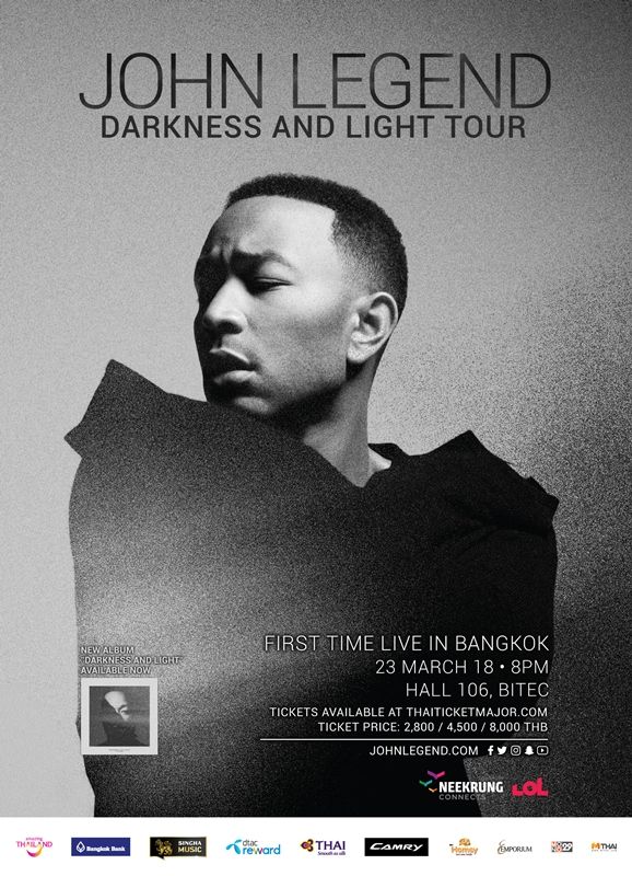 พร้อมแล้วกับโชว์คอนเสิร์ตดีที่สุดแห่งปี 2018 “JOHN LEGENDDARKNESS AND LIGHT TOUR(จอห์น เลเจนด์ดาร์คเน็ซแอนด์ ไลท์ ทัวร์)” คอนเสิร์ตเต็มรูปแบบครั้งแรกในประเทศไทยของ JOHNLEGEND(จอห์น เลเจนด์) ศิลปินแนว ป๊อป อาร์&บี โซล ฮิปฮอป ที่โด่งดังที่สุดในยุคนี้ และเขาเลือกประเทศไทยเป็นประเทศสุดท้ายปิดการทัวร์คอนเสิร์ตในเอเซีย