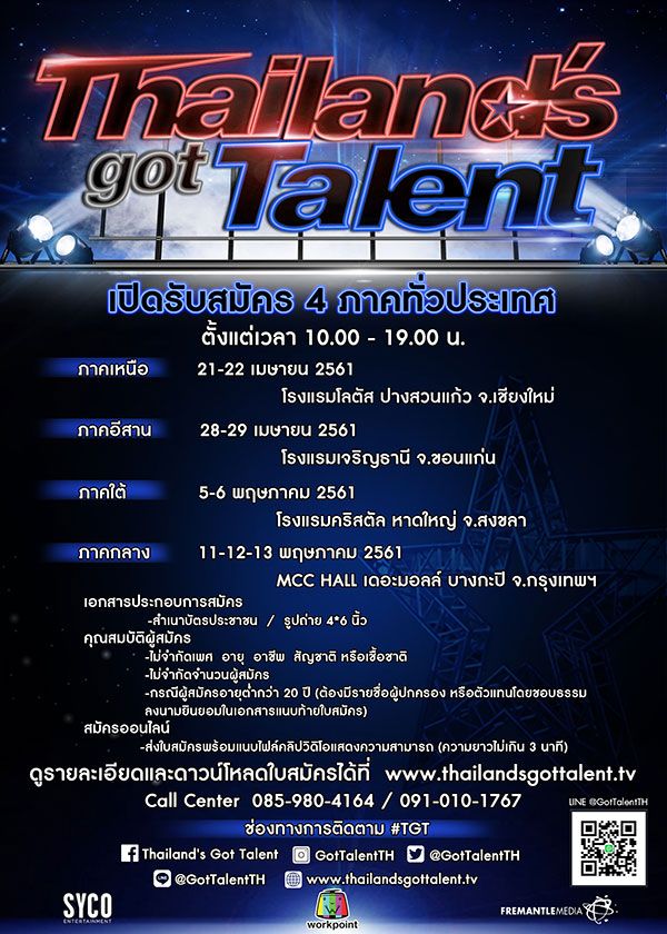 ดาวน์โหลดใบสมัคร www.thailandsgottalent.tvหรือสอบถามโทร. 085 – 980 – 4164 , 091 – 010 – 1767อย่ามัวแต่รอช้า!! ได้เวลาโชว์ทาเลนต์ให้โลกได้เห็นกันแล้ว!!