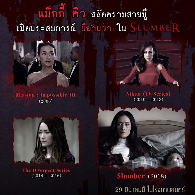 ต้องบอกว่าเป็นอีกหนึ่งนักแสดงสาวฝีมือน่าจับตาไม่เบา สำหรับ “แม็กกี้ คิว” ลูกครึ่งอเมริกัน-เวียดนาม ที่เข้าสู่วงการบันเทิงในฐานะนางแบบแถวหน้าของเอเชียตั้งแต่อายุ 18 ปี และเธอก็สามารถพิสูจน์ตัวเองด้วยการเข้ามาเป็นส่วนหนึ่งในภาพยนตร์เรื่องดังมาหลายต่อหลายเรื่อง ไม่ว่าจะเป็น Mission : Impossible III , Nikita (TV Series) , The Divergent Series และล่าสุดเธอก็ได้สลัดคราบหนังบู๊ หันมารับเล่นภาพยนตร์ชวนขวัญผวาใน “Slumber ผีอำผวา” กับบทบาทของ “อลิซ” แพทย์ผู้เชี่ยวชาญด้านปัญหาการนอนหลับ