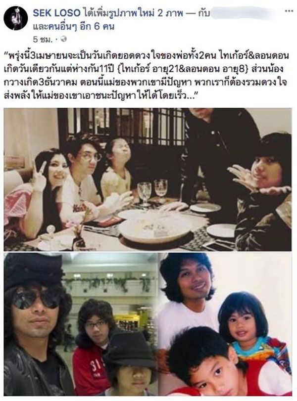 "พรุ่งนี้ 3 เมษายน จะเป็นวันเกิดของยอดดวงใจของพ่อทั้ง 2 คน ไทเกอร์&ลอนดอน เกิดวันเดียวกันแต่ห่างกัน 11 ปี (ส่วนน้องกวางเกิด 3 ธันวาคม) ตอนนี้แม่ของพวกเขามีปัญหา พวกเราก็ต้องรวมดวงใจส่งพลังให้แม่ของเขาเอาชนะปัญหาให้ได้โดยเร็ว…”
