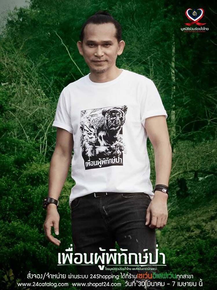 “ถือเป็นการเริ่มต้นการศึกษาทดลองสนับสนุนอย่างยั่งยืนครับ กำลัง จนท. จำนวน 226 นาย กับภาระการดูแลพื้นที่ป่า 1.3 ล้านไร่ มิใช่เรื่องง่ายเลยทีเดียว แถมยังต้องควรมีกำลังใจและการสนับสนุนที่ดีจากพวกเราที่เป็นแนวหลังเราจะไม่ปล่อยให้เค้ายืนสู้เพียงลำพัง เราจึงได้รวมตัวกันทำโครงการทดลองขึ้นมาสำหรับการช่วยดูแลพี่น้อง จนท.ป่าไม้อย่างเป็นระบบในระยะยาว กับ “โครงการจัดตั้งกองทุนผู้พิทักษ์ป่า”เขตรักษาพันธุ์สัตว์ป่า ทุ่งใหญ่นเรศวรด้านตะวันตกที่อยู่ในพื้นที่จังหวัดกาญจนบุรี ซึ่งพื้นที่คงเหลือในนี้มีเนื้อที่ 1,331,062 ไร่ มีลักษณะทางภูมิประเทศเป็นภูเขาสลับซับซ้อน และเป็นต้นกำเนิดของแม่น้ำลำธารที่สำคัญเช่น แม่น้ำแควน้อยและแม่น้ำแควใหญ่ พื้นที่ของเขตรักษาพันธุ์สัตว์ป่าทุ่งใหญ่นเรศวรเป็นแหล่งที่อยู่อาศัยของสัตว์ป่าหายากหลายชนิด บางชนิดใกล้สูญพันธุ์ หรือเป็นสัตว์เฉพาะถิ่นหรือสัตว์ถิ่นเดียว เช่น ช้างป่า, กระทิง, เสือชนิดต่างๆ, ไก่ฟ้าหลังเทา, เป็ดหงส์, เป็ดก่า, นกเงือก, ควายป่า, เลียงผา, เสือดาว, เสือดํา,หมาใน, นกยูงไทย และแมลงป่าชนิดต่างๆ อีกมากมายใครจะเคยคิดว่า จนท.เหล่านี้ต้องแบกภาระหน้าที่เฉลี่ยต่อคนหนึ่งต้องดูแลผืนป่าถึง “5,889 ไร่” หรือเทียบเท่ากับต้องดูแลพื้นที่ถึงคนละ 2,326 สนามฟุตบอลเลยทีเดียวครับ เบื้องต้นรายได้จะนำสมทบทุนตามความต้องการความจำเป็นเร่งด่วน และสำหรับการจัดหา “ประกันภัยประกันชีวิต/อุปกรณ์จำเป็น/อุปกรณ์เทคโนโลยีช่วยตรวจลาดตระเวน/อุปกรณ์สื่อสาร/อาหารแห้งและยารักษาโรค รวมถึงทุนการศึกษาสำหรับลูกๆ จนท.บางส่วนทั้งหมดนี้ให้กับ จนท.ป่าไม้ทุกระดับในส่วนพื้นที่รักษาป่าทุ่งใหญ่นเรศวรด้านตะวันตกทั้ง 226 ชีวิต และจะขยายต่อไปยังพื้นที่อื่นๆ อย่างต่อเนื่อง และเป็นระบบครับ เราต้องการกำลังการสนับสนุนจากทุกท่าน จากประชาชนทุกคนครับ...รายได้หลังจากหักค่าใช้จ่ายจากการจัดจำหน่าย เราจะตั้งกองทุนโครงการเพื่อนผู้พิทักษ์ป่า โดยมูลนิธิร่วมร้อยใจไทย และกลุ่มศิลปินดารานักแสดงกันต่อไป สั่งจอง และจำหน่ายผ่านระบบ 24Shopping ได้ที่ร้านเซเว่นอีเลฟเว่น (7-ELEVEN) ทุกสาขา ตั้งแต่วันนี้ไปจนถึงวันที่ 10 เมษายน 2561 นี้ ในราคา 300 บาท และ 350 บาท สำหรับไซส์พิเศษ (XXL / 3XL) ครับ หรือโทร.สอบถามได้ที่ 02-7807600 หรือหากต้องการซื้อจำนวนมากสามารถติดต่อมูลนิธิร่วมร้อยใจไทยได้โดยตรงที่เบอร์โทร.086-3544867 ครับ”