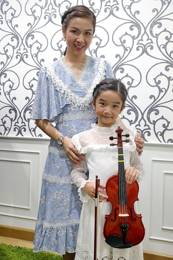 คุณกบเผยว่า “ปกติกบจะเสริมให้เค้าทุกด้าน ให้เรียนตามความชอบ น้องณดาเรียนนานาชาติซึ่งกิจกรรมก็จะเยอะอยู่แล้ว สิ่งที่เสริมให้เค้าเพิ่มเติมอีกคือกีฬา ดนตรี ภาษาไทย และเรียนรำไทยค่ะ อย่างวันนี้มาเรียนที่ Yamaha Music School ปกติน้องณดาเล่นเปียโนอยู่แล้ว ซึ่งช่วยให้เค้าได้ใช้มือทั้งสองข้างได้อย่างสมดุลกันมากขึ้น รวมถึงไวโอลินที่เค้าจะชอบเป็นพิเศษ เรียนรู้ได้ไวมาก ก็ช่วยด้วยเช่นกันเพราะต้องจับคอร์ดด้วยมือซ้าย ถ้าใช้มือทั้งสองข้างได้ดีก็จะพัฒนาสมองทั้งสองด้านได้ดีด้วยค่ะ” สังเกตุได้เลยว่าขณะที่น้องณดาเล่นดนตรีจะมีสมาธิ และมีความสุขมาก ส่วนคุณแม่กบก็ให้กำลังใจอย่างใกล้ชิด ซึ่งส่วนนี้คุณครูที่ Yamaha Music School ก็ยังแอบชื่นชมคุณแม่คนเก่งไปด้วยค่ะ