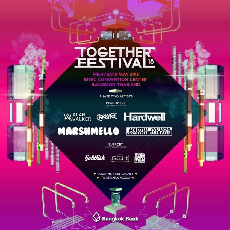 Together Festival 2018 แดนซ์ยับ 2 วันเต็ม 4-5 พฤษภาคม 2561 ณ ไบเทค บางนา รีบซื้อบัตรด่วน ราคาบัตรเฟสสอง บัตรท่านละ 2,895 บาท และบัตรกรุ๊ป 6 ท่าน ราคา 17,091 บาท จำหน่ายแล้วทาง http://www.togetherfestival.net รีบซื้อด่วน พิเศษสุด ซื้อบัตรผ่าน Debit / Credit ของธนาคารกรุงเทพ รับส่วนลดไปเลย 10%