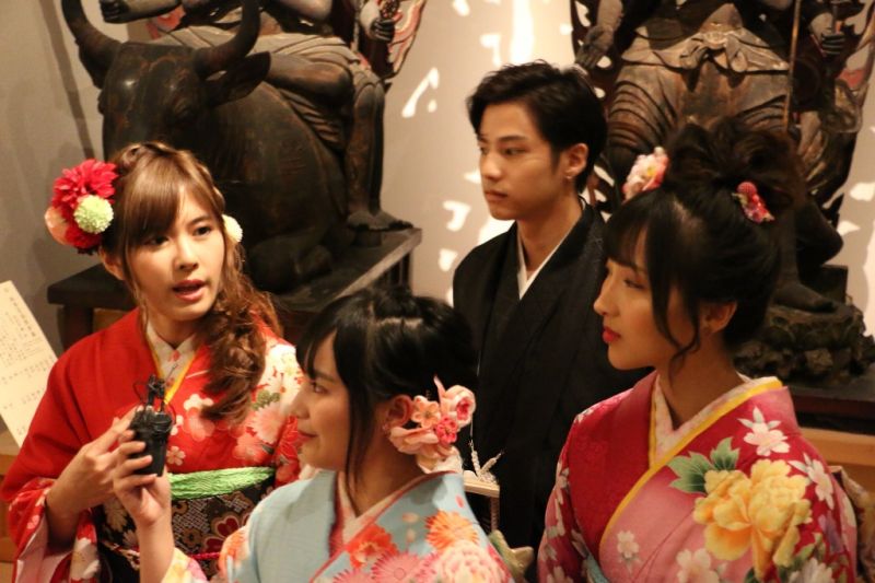 เริ่มที่แรกคือ วัดไดคะคุจิ ที่ทำเอาทุกคนตื่นเต้นสุดๆ งานนี้นอกจากจะได้ไปชมความงดงามของสถาปัตยกรรมโบราณที่วัดไดคะคุจิที่มีอายุกว่า 1,200 ปี ทั้งภาพเขียน ทั้งโบราณวัตถุ รวมถึงพิพิธภัณฑ์ที่มีการรวบรวมศิลปะเก่าแก่ ซึ่งจะมีการเปลี่ยนของที่นำมาโชว์ ทุกฤดูใบไม้ร่วง และ ฤดูใบไม้ผลิแล้ว 3 สาว และหนุ่มแบงค์ยังได้ลองใส่ชุดกิโมโนเป็นครั้งแรก แต่ที่พิเศษระดับท๊อปคือปีนี้เป็นปีที่ครบรอบวันสำคัญของวัดไดคะคุจิ ที่จะเปิดให้สักการะ “หัวใจสุตรา” บันทึกของพระจักรพรรดิอันเก่าแก่ที่ไม่ได้เปิดให้คนทั่วไปเข้าชมทุกวัน แต่เปิดเพียง 60 ปีครั้ง ซึ่งตรงกับปีนี้ วันที่ 1 ตุลาคม 2561 งานนี้แบงค์และ 3 สาว เลยขอถ่ายภาพด้านหน้าไว้ก่อนเป็นที่ระลึก แถมเปรยว่านักเดินทางไม่น่าพลาดที่จะล็อคพิกัดไว้ในใจ