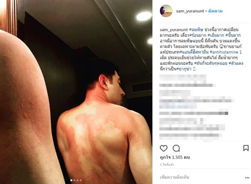 แซม ยุรนันท์ ภมรมนตรี” ที่ต้องเข้าโรงพยาบาลหาหมอ เนื่องจากมีอาการลมพิษและมีผื่นแดงขึ้นเต็มตัวโดย แซม ยุรนันท์ ได้ออกมาเผยภาพตัวเองที่มีผื่นขึ้น และระบุว่า “ลมพิษ ช่วงนี้อากาศเปลี่ยนมากนะครับ เดี๋ยว ร้อนมาก เย็นมาก ชื้นมาก อาจมีอาการลมพิษแบบนี้ มีผื่นคัน บวมแดงขึ้นตามตัว โดยเฉพาะตามข้อพับครับ ทานยาแก้แพ้ประเภท แอนตี้ฮีสทามีน antihistamine 1 เม็ด ประคบเย็นช่วยให้หายคันได้ ดื่มน้ำมากๆ และพักผ่อนนะครับ มันก็จะคันๆหน่อย ตัวแดง นึกว่าเป็นยากูซ่า”