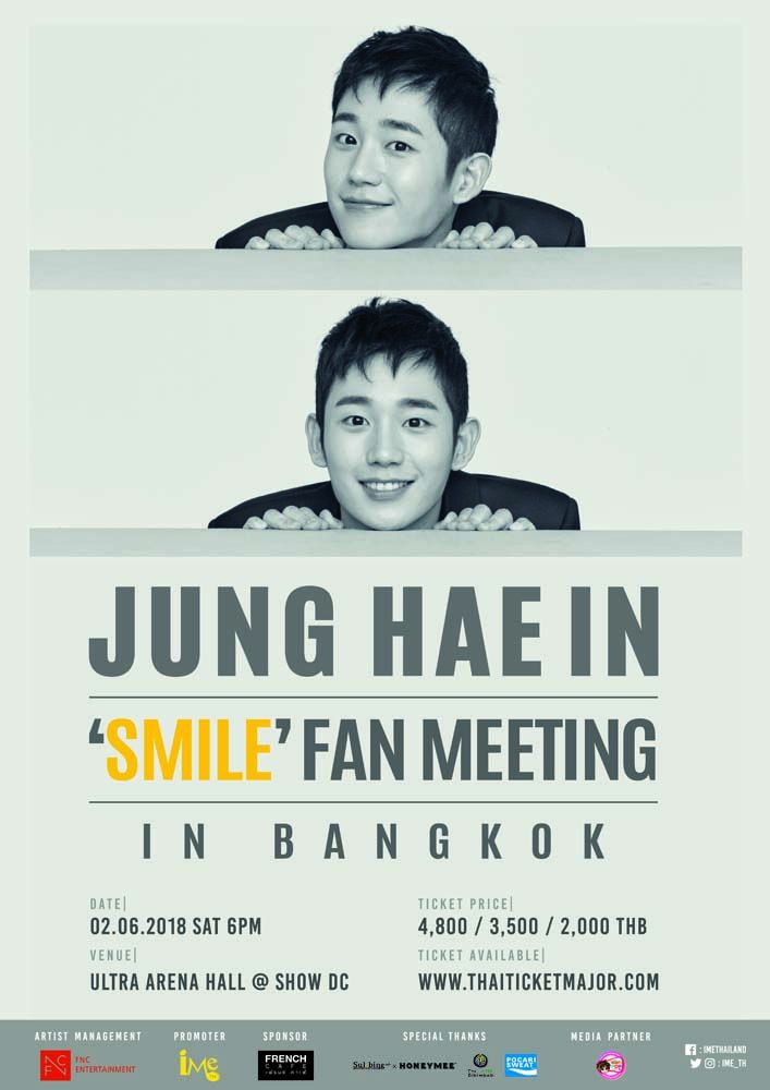 งานนี้เปิดขายบัตรเสาร์ที่ 5 พฤษภาคมนี้ และเขาพร้อมแล้วที่จะมาโปรยเสน่ห์ให้นูน่าไทยใจละลายในงาน “JUNG HAE IN ‘SMILE’ FAN MEETING IN BANGKOK” ซึ่งจะจัดขึ้นในวันเสาร์ที่ 2 มิถุนายน 2561 เวลา 18.00 น. ณ อัลตร้า อารีน่า ฮอลล์ ชั้น 6 โชว์ ดีซี บัตรราคา 4,800 / 3,500 และ 2,000 บาท จำหน่ายบัตรผ่านทาง เคาน์เตอร์ไทยทิคเก็ตเมเจอร์ ทุกสาขา หรือ www.thaiticketmajor.com และ Call Center 02-262-3456 หรือติดตามรายละเอียดเพิ่มเติมได้ที่ www.facebook.com/IMEthailand หรือ Twitter: @ime_th และ Instagram: @ime_th