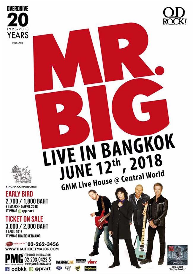 Mr.BIG LIVE IN BANGKOK พร้อมระเบิดความมันส์กันใน วันที่ 12 มิถุนายน 2561 ณ GMM LIVE HOUSE@Central World เวลา 19.00 น. บัตรราคา 3000/2000 บาท จำหน่ายบัตรที่ PMG และ Thai Ticket Major ติดต่อสอบถามรายละเอียดได้ที่ Pmg/Odbkk Line @prart 02-2030423-6 http://www.facebook.com/odbkk