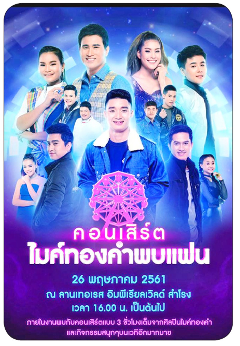 ll ส่วนใครที่เป็นแฟนคลับ “ไมค์ทองคำ” ไม่ต้องรอนานเพราะ “คอนเสิร์ตไมค์ทองคำพบแฟน“ ปีนี้กลับมาอีกครั้งยิ่งใหญ่กว่าเดิมกับการรวบรวมศิลปินจากเวทีประกวดร้องเพลงลูกทุ่งเรตติ้งอันดับหนึ่งของประเทศ จัดเต็มให้แฟนๆ กับคอนเสิร์ต 3 ชั่วโมงเต็ม จากศิลปินและกิจกรรมสนุกๆ บนเวทีอีกมากมาย ณ ลานเทอเรส อิมพีเรียลเวิลด์ สำโรง วันเสาร์ 26 พฤษภาคม 2561 เวลา 16.00 น. เป็นต้นไป...