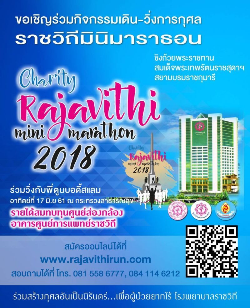 โรงพยาบาลราชวิถี ขอชวนคนไทยร่วม “เดิน-วิ่งการกุศล ราชวิถี มินิมาราธอน 2018” ชิงถ้วยพระราชทาน สมเด็จพระเทพรัตนราชสุดาฯ เพื่อหารายได้สมทบทุนจัดซื้อเครื่องมือแพทย์ และสร้างศูนย์ส่องกล้อง อาคารศูนย์การแพทย์ฯ งานนี้…นอกจากจะได้บุญและได้สุขภาพดีแล้ว ยังได้มีโอกาสร่วมวิ่งกับ พี่ตูน บอดี้สแลม ด้วย ในวันอาทิตย์ที่ 17มิถุนายน 2561 เวลา 04.00 น. ณ กระทรวงสาธารณสุข