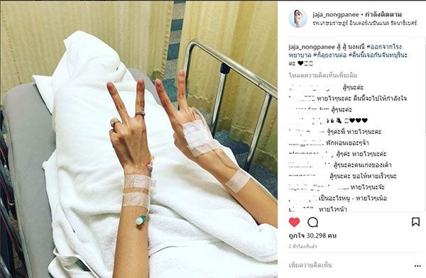 ทำเอาแฟนคลับตกอกตกใจ เมื่อลูกทุ่งสาวเซ็กซี่ “จ๊ะ อาร์สยาม” โพสต์รูปชูสองนิ้วพร้อมสายน้ำเกลือบนเตียงคนไข้ พร้อมเช็คอินที่โรงพยาบาลเกษมราษฎร์ อินเตอร์เนชั่นแนล รัตนาธิเบศร์ ผ่านไอจี @jaja_nongpanee ในข้อความ “สู้ สู้ นงผณี #ออกจากโรงพยาบาล #ก็ลุยงานต่อ #คืนนี้เจอกันจันทบุรีนะคะ”