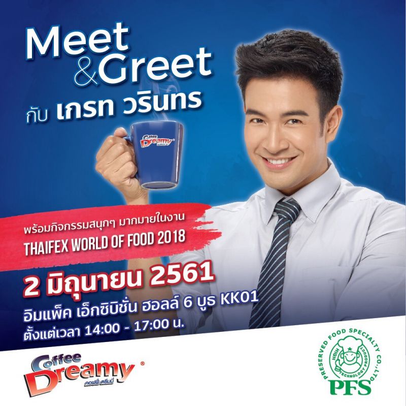 ขึ้นชื่อว่าเป็นดาราหนุ่มอารมณ์ดีที่งานแน่นอีกคน สำหรับ เกรท- วริทร ล่าสุดเตรียมชวนเหล่าแฟนคลับ มาร่วมสนุกกันแบบมันได้ มันดี มันอร่อยลงตัว กับ ครีมเทียม คอฟฟี่ ดรีมมี่ ในงาน Thai Fex 2018 ที่บูธ PFS KK01 อิมแพคอารีน่าเมืองทองธานี วันเสาร์ที่ 2 มิถุนายน 2561 ตั้งแต่เวลา 15.00 น. เป็นต้นไป นอกจากจะได้รับของที่ระลึกสุดพิเศษพร้อมถ่ายภาพแบบใกล้ชิดแล้ว แว่วมาว่างานนี้ หนุ่มเกรท จะมีโชว์สนุกๆ ให้ชมกันด้วย จะมันได้ มันดีขนาดไหน แฟนคลับห้ามพลาด
