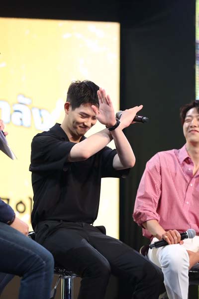 แล้วก็มาถึงช่วงบอร์ดคำถามจากแฟนๆ ที่สองหนุ่มต้องเลือกคำถามของอีกฝ่ายมาถามคนละ 3 ข้อ ถ้าใครชนะจะได้ครอบครองบ๊อยซ์ไทยทั้งหมด ก่อนเริ่มก็มีบลัฟกันนิดหน่อย จงฮยอนว่า “เบาๆหน่อย” ส่วนจองชินบอก “สงสัยผมจะได้ครอง” พอเลือกคำถามจากแฟนๆได้แล้ว จงฮยอน ก็เริ่มถามก่อน “เมื่อไหร่จองชินจะไว้ผมยาวอีก? อีกไม่นานก็ต้องไถหัวแล้วนะ” จองชินตอบว่า “เดี๋ยวกลับจากไปเป็นทหารคงไว้ผมยาวไม่ทัน เดี๋ยวคงต้องลองต่อผมดู” คราวนี้สลับมาถามจงฮยอนบ้าง “ทำไมจงฮยอนอ้วนขึ้นเยอะเลย?” เจ้าตัวตอบสั้นๆแต่มีเหตุผลว่า “อายุมากขึ้น” ถึงตาจองชินบ้าง “ขอกอดหน่อยได้มั้ย?” เจ้าตัวรีบเอาใจ “ได้แน่นอน ผมจะกอดแฟนคลับที่ขึ้นมาบนเวทีคนแรกเลย” ข้อต่อมา “ถ้าเป็นจองชินได้ 1 วัน จะทำอะไร?” จงฮยอนตอบว่า “อยากจะลองสูดอากาศข้างบนดู เพราะคิดว่าจองชินสูงมาก” ต่อมาเป็นคำถามที่เหมือนคำสั่งมากกว่า “Sexy Dance” ตอนแรกจองชินแกล้งฟังไม่รู้เรื่อง แต่แล้วก็ถามว่ามีเพลงเหรอ พอจังหวะเพลงดังขึ้นจองชินก็ลุกขึ้นหันก้นส่ายสะโพกอวดแฟนคลับไปกับเพลงประกอบสุดฮิตของไทย “เต่างอย” ได้อย่างเข้ากั๊นเข้ากัน แถมบอกว่าเตรียมซ้อมเต้นมาอย่างดีเพราะกะไว้แล้วว่าต้องมีคำถามแนวนี้แน่ๆ ด้าน จงฮยอน ก็ไม่ต่างกันเพราะโดนขอให้ทำท่าน่ารักที่สุดในโลกให้ดูหน่อย เลยได้ฟินไปกับท่าชูสองนิ้วทำแก้มป่องของหนุ่มขี้อายคนนี้ เรียกว่าแค่ในช่วงแรกก็เรียกเสียงหัวเราะและกรี๊ดไปกันหนึ่งยกใหญ่ซะแล้ว