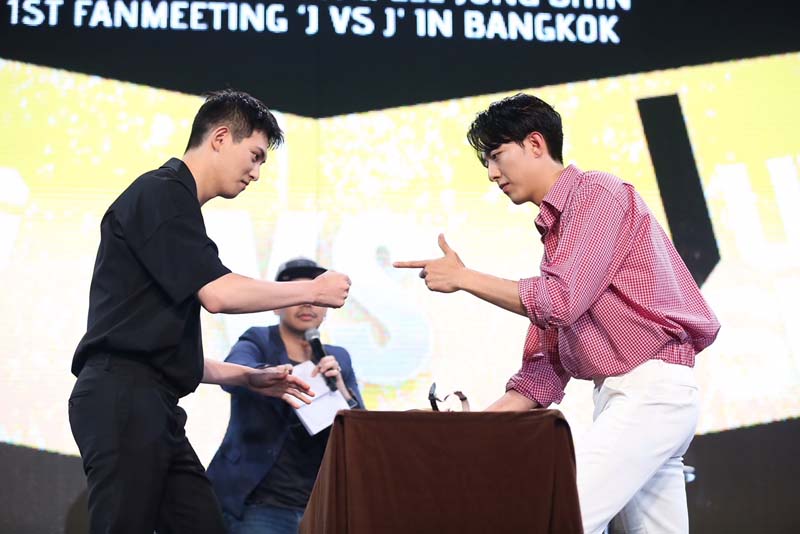 ถึงตา จองชิน ถามบ้าง ข้อแรก “จงฮยอน ชอบอ่านหนังสือมากกว่าตกปลา?” (ตอบ O ด้วยเหตุผลที่ว่า “ก็พี่หัวดี”) ข้อสอง “น้ำหนักพี่จงฮยอนตอนนี้คือหนักที่สุดในชีวิตแล้ว?” (X เพราะตอนจัดแฟนมีตที่เกาหลีหนักตั้ง 76 kg แต่ตอนนี้หนักแค่ 74 kg เอง) ข้อสาม “อวัยวะที่มั่นใจที่สุดคือดวงตา?” (O ข้อนี้จองชินตอบถูกเพราะชมว่าพี่จงฮยอนผู้ตอบทุกอย่างตามใจตัวเองมีดวงตาเป็นประกายที่สุด พอถามว่าทำไมถึงชอบดวงตาที่สุด เจ้าตัวก็ตอบตรงๆ “เพราะดวงตาไม่อ้วนครับ” เรียกเสียงฮาไปอีก) ข้อสี่ “เครื่องดื่มที่จงฮยอนชอบมากที่สุดคือชานม?” (X ข้อนี้จองชินตอบผิด เพราะเครื่องดื่มเปรี้ยวๆที่เคยเห็นพี่จงฮยอนกินบ่อยๆนั่น พี่เค้าเบื่อแล้ว ช่วงนี้ชอบกินชานมที่สุด แต่มาเมืองไทยรอบนี้ จองชิน ชอบกินน้ำแตงโมปั่น แถมยังขอให้แฟนๆแนะนำร้านอร่อยผ่าน SNS ส่วนตัวของเขาให้ด้วย) ข้อห้า “จงฮยอนคิดว่าตัวเองหล่อกว่าจองชินมาตั้งนานแล้ว?” (O จองชินตอบพลางบ่นว่าไม่น่าถามคำถามแบบนี้เลย) ยกนี้น้องจองชินตอบผิดไปหนึ่งข้อ พี่จงฮยอนเลยชนะไป