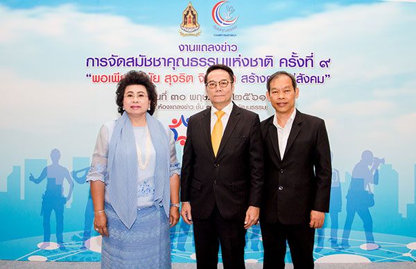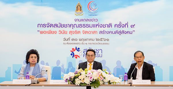 ศูนย์คุณธรรม (องค์การมหาชน) กระทรวงวัฒนธรรม ร่วมกับหน่วยงานและองค์กรภาคีภาคส่วนต่างๆ จัดงานสมัชชาคุณธรรมแห่งชาติ ครั้งที่ ๙ ภายใต้แนวคิด “พอเพียง วินัย สุจริต จิตอาสา สร้างคนดีสู่สังคม” ระหว่างวันที่ ๑๔-๑๕ มิถุนายน ๒๕๖๑ ณ ศูนย์วัฒนธรรมแห่งประเทศไทย เพื่อเป็นเวทีกลางของเครือข่ายคุณธรรมทุกภาคส่วน ได้มีส่วนร่วมในการแลกเปลี่ยนเรียนรู้การส่งเสริมและพัฒนาคุณธรรม จริยธรรม การสร้างความเข้าใจและสนับสนุนการขับเคลื่อนตามยุทธศาสตร์ของแผนแม่บทส่งเสริมคุณธรรมแห่งชาติ ฉบับที่ ๑ (พ.ศ.๒๕๕๙ – ๒๕๖๔) พร้อมตอกย้ำแนวคิดนี้กับสังคมไทย ให้เกิดเป็นกระแส สร้างความตระหนักและตื่นตัว ในการขับเคลื่อนคุณธรรม อย่างกว้างขวาง มุ่งเน้นการเสริมสร้างจิตสำนึกคุณธรรมในรูปแบบต่างๆ เพื่อสร้างภูมิคุ้มกันให้หน่วยงาน องค์กร ชุมชน และประชาชนนึกถึงประโยชน์ส่วนรวมมากกว่าประโยชน์ส่วนตน อีกทั้งยังเป็นการประกาศเจตนารมณ์ของภาคีเครือข่ายสมัชชาคุณธรรมแห่งชาติ ครั้งที่ผ่านมา เพื่อขยายผลสู่การปฏิบัติในระดับภูมิภาค และหาแนวทางร่วมในการขับเคลื่อนคุณธรรมในอนาคต