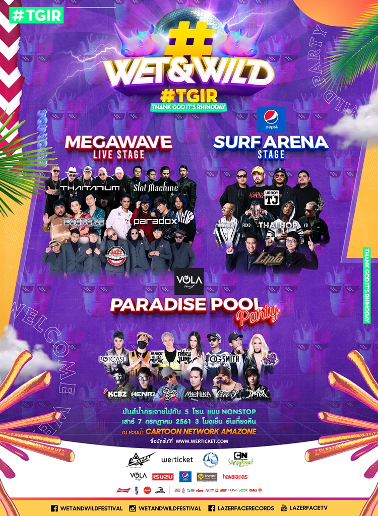 ต้อนรับการกลับมาของปาร์ตี้แรดแบบสุดๆ กลางสายน้ำสุดหรรษาเตรียมตัวให้พร้อมกับเทศกาลดนตรีกลางสายน้ำประจำปีใหญ่ที่สุดในประเทศไทยที่เคยสร้างความประทับใจกับความมันแบบ Non Stop กันมาแล้ว “LAZERFACE Presents WET&WILD FESTIVAL 2018 #TGIR (Thank god is Rhino Day) “ กลับมาครั้งนี้ พร้อม Line Up สุดจี๊ดที่ยกอาร์ตติสสุดแสบมาไว้รวมกันในงานเดียวกัน