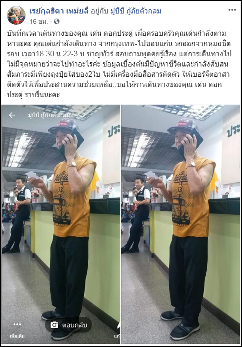 สอบถามพูดคุยรู้เรื่อง แต่การเดินทางไปไม่มีจุดหมายว่าจะไปทำอะไรค่ะ ข้อมูลเบื้องต้นมีปัญหาชีวิตและกำลังสับสน สัมภาระมีเพียงถุงปุ๋ยใส่ของ2ใบ ไม่มีเครื่องมือสื่อสารติดตัว ให้เบอร์จิตอาสา ติดตัวไว้เพื่อประสานความช่วยเหลือ..ขอให้การเดินทางของคุณ เด่น ดอกประดู่ ราบรื่นนะคะ