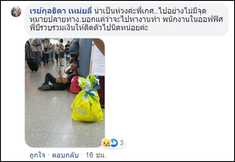 ก่อนจะโพสต์ภาพถุงปุ๋ย พร้อมบอกว่า “น่าเป็นห่วงค่ะพี่เกศ..ไปอย่างไม่มีจุดหมายปลายทาง.บอกแค่ว่าจะไปหางานทำ พนักงานในออฟฟิศพี่บีรวบรวมเงินให้ติดตัวไปนิดหน่อยค่ะ ขณะที่ล่าสุด มีคนแจ้งว่าตลกดังอยู่ที่ขอนแก่น ถ้ามีญาติจะมารับได้ที่ บขส.3