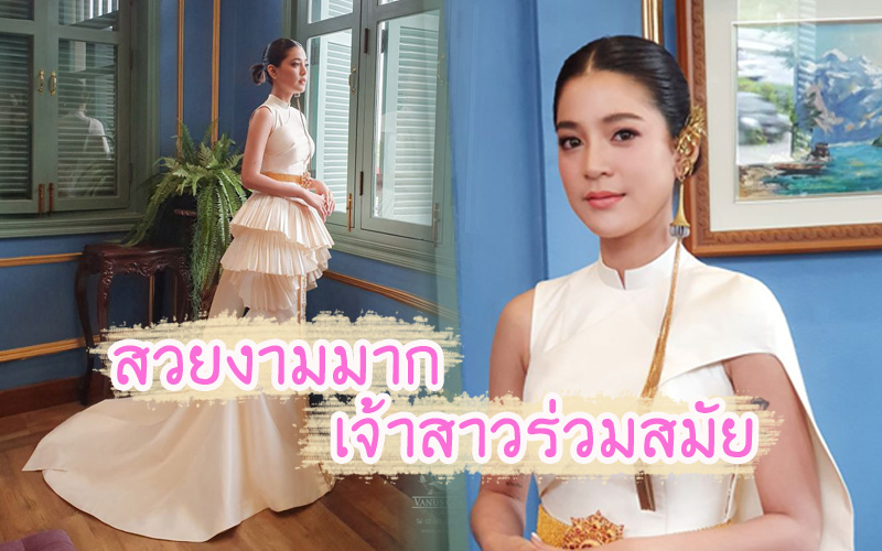 โดยจับความเป็นไทยและจีนมาไว้ด้วยกันชุดแต่งงานเป็นรูปแบบแนวร่วมสมัย ช่วงบนของชุดถูกดีไซน์เป็นลักษณะคอจีน ส่วนกระโปรงเป็นแบบหางปลามีชายลากยาว ความเก๋อยู่ที่สไบด้านหลังที่สามารถถอดได้เพื่อให้กลายเป็นชุดกี่เพ้าในช่วงยกน้ำชาได้ด้วยปกติชุดไทยของทางร้านจะเน้นงานปักโดยส่วนใหญ่ แต่ชุดนี้แทบจะมีงานปักน้อยมากจะมีก็แค่บริเวณหน้านางที่ตัวกระโปรงมีการปักลวดลายเพื่อเพิ่มมิติให้ชุดดูสวยงามเท่านั้นทั้งนี้ก็เพื่อให้เหมาะกับสไตล์ของเจ้าสาวนั่นเอง ตัวชุดเป็นสีดอกจำปีซึ่งเป็นสีมงคลหมายถึงความร่ำรวยและเงินทอง