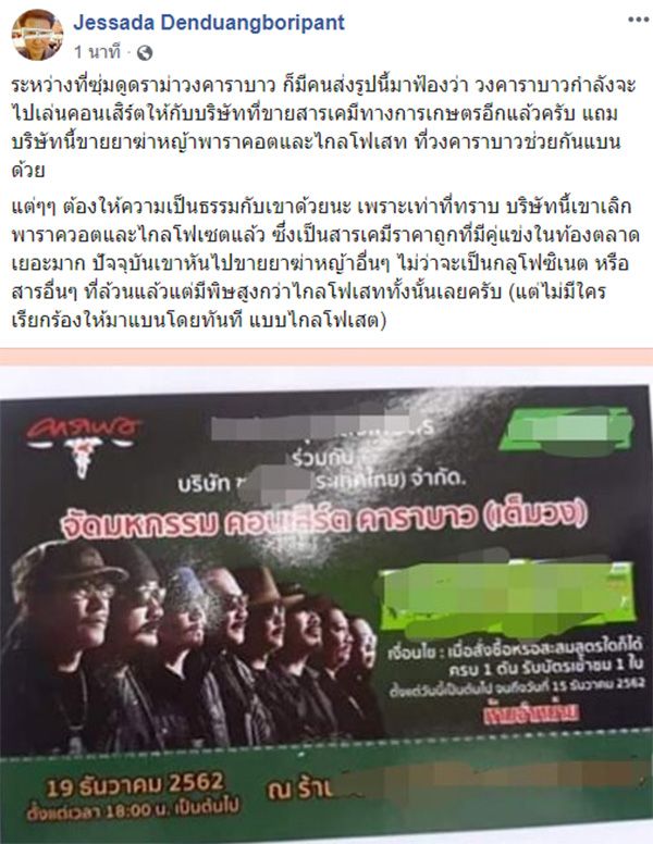 ปล. เท่าที่ไปไล่ดูโพสต์ย้อนหลังในเพจพี่เทียรี่ มีแต่โพสต์เรื่องแบนสารเคมีทางการเกษตรทั้ง 3 สารเลย ไม่รู้ว่า เกี่ยวข้องกันกับประเด็นที่วงคาราบาว ก็ไปเล่นคอนเสิร์ตให้บริษัทเคมีทางการเกษตรเหมือนกัน หรือเปล่า
