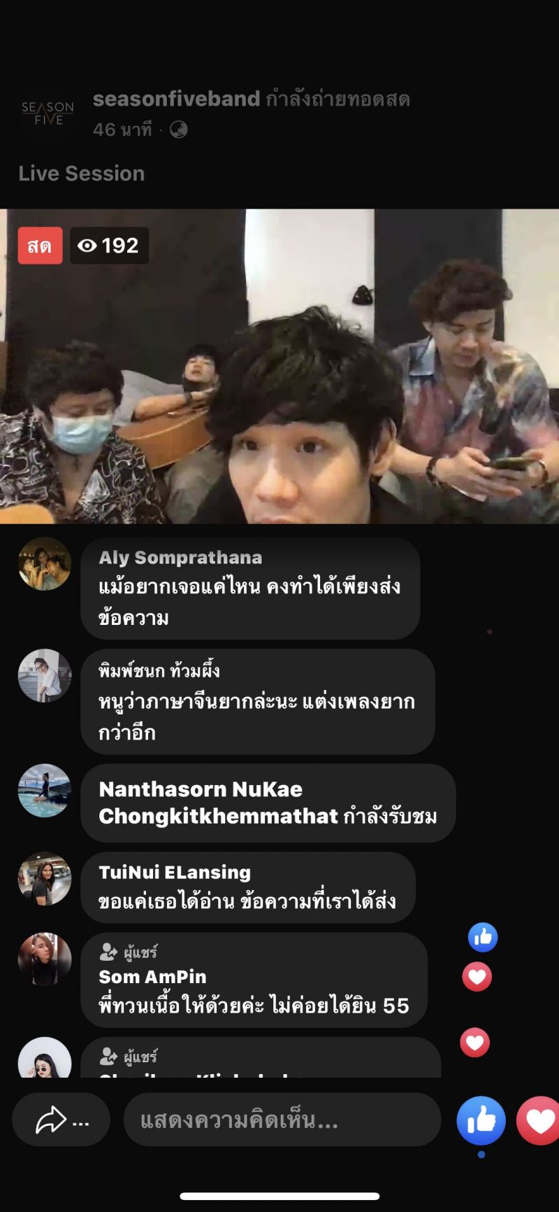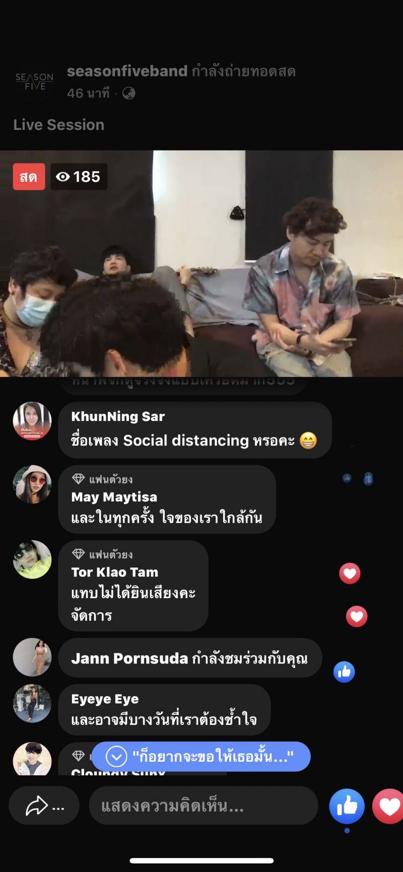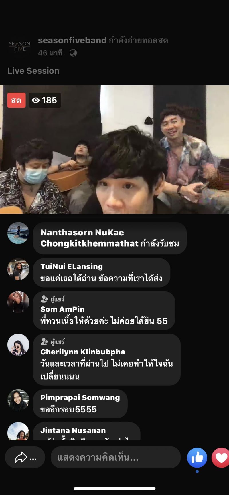 วง ซีซันไฟฟ์ ( SEASON FIVE) “ อย่างแรกเลยต้องขอบคุณแฟนเพลงทุกๆคนนะครับ ที่เข้ามาดูไลฟ์ของพวกเรา และ ช่วยกันแต่งเพลงนี้ขึ้นมากันแบบสดๆเลย ได้ชื่อเพลงว่า ไม่รับรักผ่านจออันฟอลนะจ๊ะ ก็เข้ากับสถานการณ์ตอนนี้ครับ เพราะช่วงนี้ทุกคนต้องห่างกัน จากที่ได้เจอกันบ่อยๆ กลับต้องอยู่บ้านของตัวเองไปก่อนในช่วงนี้เพราะทุกคนจะได้ปลอดภัยนะครับ แต่ก็ใช่ว่าเราจะเจอหน้ากันไม่ได้เพราะก็ยังมีจอมือถือ หรือ ช่องทางออนไลน์ต่างๆที่พวกเราสามารถเห็นหน้ากันได้ และพวกเราเหล่าศิลปินถ้าจะมีช่องทางไหนที่ทำให้แฟนเพลงได้มีรอยยิ้ม ได้มีความสุข ได้เจอกันกับพวกเราได้บ้าง แม้จะเพียงเห็นหน้าก็เถอะพวกเราพร้อมเสมอครับที่จะทำให้ทุกคน เช่นการไลฟ์ ของเราก็ทำให้คลายคิดถึงไปได้บ้าง ก็อยากให้ทุกคนรักษาสุขภาพ ล้างมือ กินร้อน ช้อนใครช้อนมัน ก่อนนะครับในช่วงนี้ ขอเป็นกำลังใจให้กับทุกคนนะครับ เมื่อสิ่งที่เกิดขึ้นอยู่ตอนนี้ผ่านไปพวกเราพร้อมจัดเต็มความสุขให้เต็มที่แน่นอนครับ “