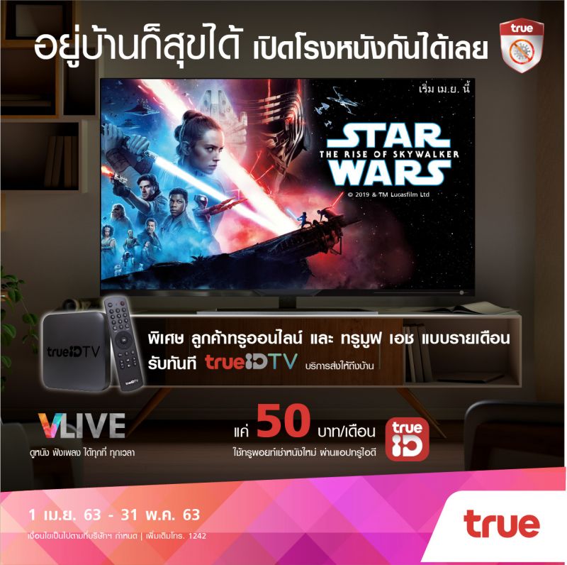 ทรูสนับสนุนนโยบาย “อยู่บ้าน หยุดเชื้อ เพื่อชาติ” รณรงค์ให้คนไทยอยู่บ้าน เพื่อหยุดยั้งและควบคุมการแพร่ระบาดของโรค “โควิด-19” พร้อมกันนี้ทรูขอมอบความสุขความบันเทิงให้คนไทยได้เพลิดเพลินผ่อนคลายไปกับ กล่อง “ทรู ไอดี ทีวี” ติดตามหนังใหม่ ซีรีส์ดัง การ์ตูนฮิต พร้อมความบันเทิงบนยูทูป และ Netflix ฟังเพลงฮิตได้จุใจ ผ่านแอปทรูไอดี อุปกรณ์ที่เปลี่ยนทีวีธรรมดาของคุณให้กลายเป็นสมาร์ททีวี เมษายนนี้ พบกับภาพยนตร์ดังๆ อย่าง Frozen II, Jumanji, Starwars, Joker และอีกมากมาย พร้อมรับโปรโมชั่นสุดพิเศษ ลูกค้าทรูออนไลน์ และ ทรูมูฟเอชแบบรายเดือน รับกล่องทรูไอดีทีวี เพิ่มค่าบริการเพียงเดือนละ 50 บาท (พร้อมรับเงินคืน 50 บาท ผ่าน True Money) บริการส่งกล่องให้ถึงบ้าน เพียงคลิกไปที่ www.truehappyfamily.com ตั้งแต่วันนี้ ถึง 31 พฤษภาคม 2563 หรือ พิเศษ วันนี้ซื้อกล่องทรูไอดี ทีวี ลด 50% เหลือเพียง 1,245 บาทรับเงินคืน 1,200 บาท พร้อมซิมทรูมูฟ เอชแบบเติมเงิน หาซื้อได้แล้ววันนี้ที่ 7-Eleven ใกล้บ้านคุณ วันนี้ถึง 30 มิถุนายนนี้