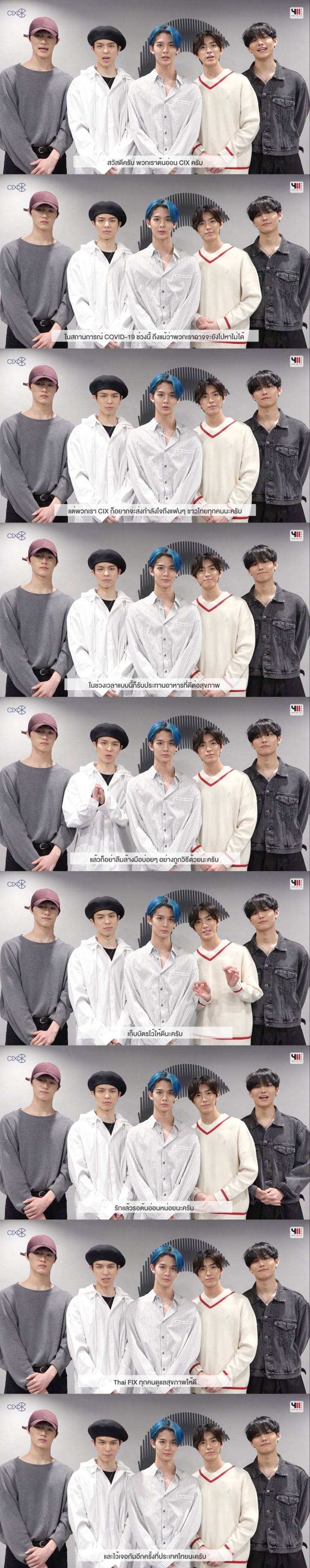 “In X! สวัสดีครับ พวกเราต้นอ่อน CIX ครับ ในสถานการณ์ COVID-19 ช่วงนี้ ถึงแม้ว่าพวกเราอาจจะยังไปหาไม่ได้ แต่พวกเรา CIX ก็อยากจะส่งกำลังใจถึงแฟนๆ ชาวไทยทุกคนนะครับ ในช่วงเวลาแบบนี้ก็รับประทานอาหารที่ดีต่อสุขภาพ นอนหลับพักผ่อนให้เพียงพอ แล้วก็อย่าลืมล้างมือบ่อยๆ อย่างถูกวิธีด้วยนะครับ งาน CIX 1st Fan Meeting HELLO, FIX in Bangkok พวกเราก็จะไปหาแฟนๆ ชาวไทยทุกคนอย่างแน่นอน หวังว่าทุกคนจะรอจนถึงวันที่จะได้เจอกันอีกครั้งนะครับ อ่า แฟนๆ ที่มีบัตรกันอยู่แล้ว เก็บบัตรไว้ให้ดีนะครับ แล้วมาเจอกับพวกเรา CIX ได้นะครับ อดใจไว้เจอกันนะครับ รักแล้วรอต้นอ่อนหน่อยนะครับ Thai FIX ทุกคนดูแลสุขภาพให้ดี และไว้เจอกันอีกครั้งที่ประเทศไทยนะครับ In X! ขอบคุณครับ”