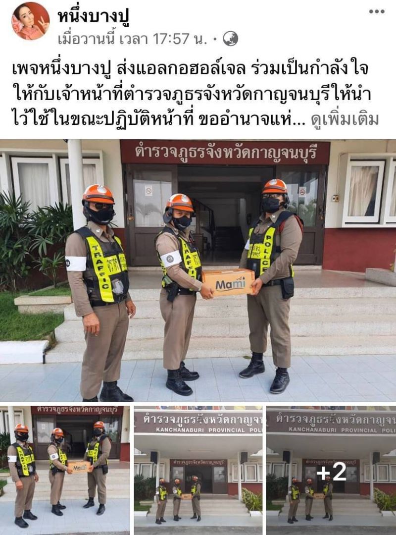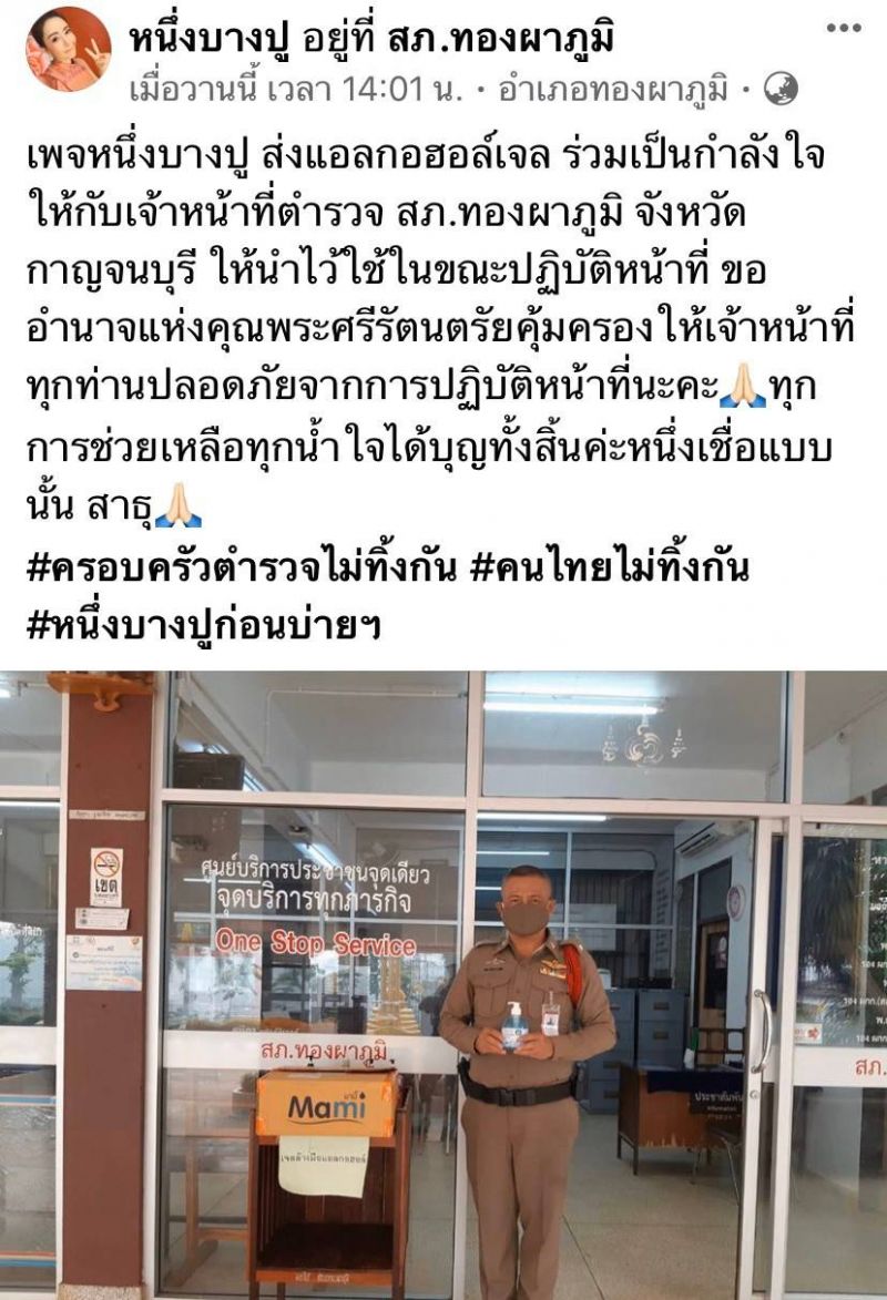 เพิ่งจะนำชาไข่มุกส่งไปเป็นกำลังใจให้กับทีมแพทย์ บุคลากรทางการแพทย์ที่วอร์ดดูแลผู้ป่วยโควิด19โรงพยาบาลตำรวจ เพราะอยากเห็นรอยยิ้มคุณหมอ พยาบาลที่ทุ่มเทงานอย่างหนักในช่วงนี้ล่าสุดดาราสาว “หนึ่ง บางปู” นักแสดงจากรายการ ก่อนบ่ายคลายเครียด ทางช่องเวิร์คพอยท์ และศิลปินเจ้าของซิงเกิ้ล รักเบาๆ, เหนื่อยมากไหม ได้นำแอลกอฮอล์เจลและหน้ากากอนามัยไปมอบให้กับเจ้าหน้าที่ตำรวจ สภ.บางปู สมุทรปราการ, สภ.ทองผาภูมิ จ.กาญจนบุรี, สถานีตำรวจภูธร จังหวัดกาญจนบุรี เพื่อนำไว้ใช้ในขณะปฏิบัติหน้าที่