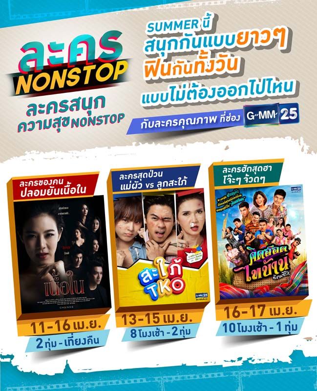เปลี่ยนช่วงเวลาอยู่บ้านของคุณไม่ให้เหงาอีกต่อไป ด้วยละครสนุกตลอดทั้งวัน ที่ช่อง GMM25ที่พร้อมส่งความสุขสร้างความสนุกเอาใจแฟนละครในช่วง Summer นี้ งานนี้ได้ฟินกันทั้งวันแบบไม่ต้องออกไปไหนกันเลยทีเดียว กับ “GMM25 ละคร NONSTOP: ละครสนุก ความสุข NONSTOP” เริ่มด้วยละครแนวแซ่บแอ๊บใสสร้างภาพเก่งของเหล่าคนปลอมอย่างเรื่อง “เนื้อใน” ออกอากาศ ให้ได้ชมกันเต็มอิ่มตั้งแต่วันที่ 11-16 เมษายน เวลา 20.00 น. – 00.00 น. นอกจากนี้ยังมีละครคอเมดี้เบาสมองสุดป่วนกับศึกระหว่างสะใภ้หมัดเพชฌฆาต ปะทะ แม่ผัวจอมโหด ใน “สะใภ้ TKO” ออกอากาศตั้งแต่วันที่ 13-15 เมษายน เวลา 08.00 น. – 20.00 น. รวมไปถึงละครสะท้อนวิถีชีวิตแบบอีสานสุดฮาโจ๊ะๆ จ้วดๆ “คิดฮอดไทบ้านอีสานซีรีส์” ติดตามบทพิสูจน์รักทางไกล ของคนหัวใจคิดฮอดกันได้ตั้งแต่วัน 16-17 เมษายน เวลา 10.00 น. – 19.00 น. น. ดูให้จุใจกันตลอดกับละครคุณภาพ ที่ช่อง GMM25 คัดสรรมาเพื่อคุณ