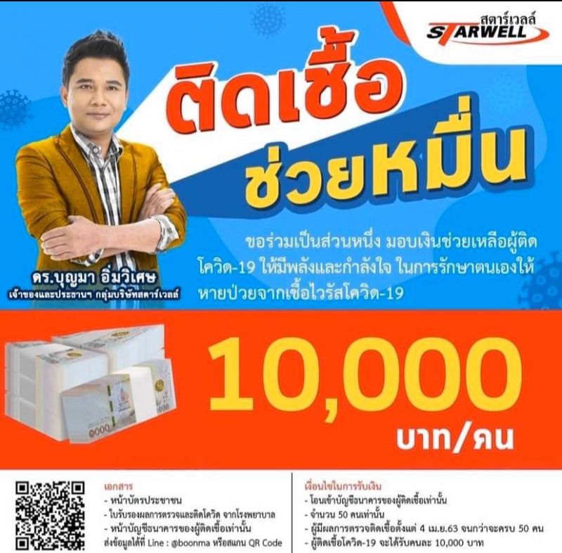 บอสใหญ่เจ้าของเวทีประกวดหนุ่มหล่อมิสเตอร์สตาร์ไทยแลนด์ เวทีหนุ่มหล่ออันดับ1ของเมืองไทย ที่ผลักดันหนุ่มหล่อเข้าวงการบันเทิงมากมาย และที่จำกันได้ติดตาก็คงเป็นภาพเจ้า “พ่อสตาร์เวลล์” ที่มีดาราดาวค้างฟ้า “จิ๊ก เนาวรัตน์” เป็นพรีเซ็นเตอร์นั่นเอง และบริษัทในเครืออีกมากมาย และเป็นคนที่ชอบช่วยเหลือสังคมมาโดยตลอด สำหรับ “ดร.บุญมา อิ่มวิเศษ” ล่าสุดจากสถานการณ์การแพร่ระบาดของไวรัส โควิด-19 ส่งผลกระทบมากมายทั้งชีวิตความเป็นอยู่ รายได้ที่เป็นปัญหาระดับโลก จึงมีความห่วงใยเพื่อนมนุษย์ด้วยกันเลยจะช่วยเหลือผู้ติดเชื้อโควิด19 ประกาศให้เงินคนละ 10000 บาท สำหรับผู้ที่ติดเชื้อ