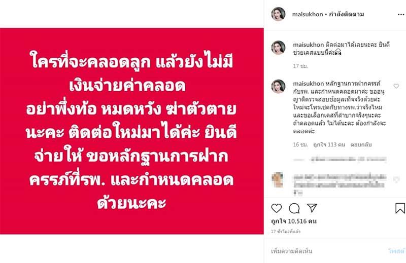 โดยใหม่ สุคนธวา ระบุว่า “ใครที่จะคลอดลูกแล้วยังไม่มีเงินจ่ายค่าคลอด อย่าพึ่งท้อ หมดหวัง ฆ่าตัวตายนะคะ ติดต่อใหม่มาได้ค่ะ ยินดีจ่ายให้ ขอหลักฐานการฝากครรภ์ที่ รพ.และกำหนดคลอด ด้วยนะคะ” พร้อมแคปชั่นว่า “ติดต่อมาได้เลยนะคะ ยินดีช่วยเคสแบบนี้ค่ะ”