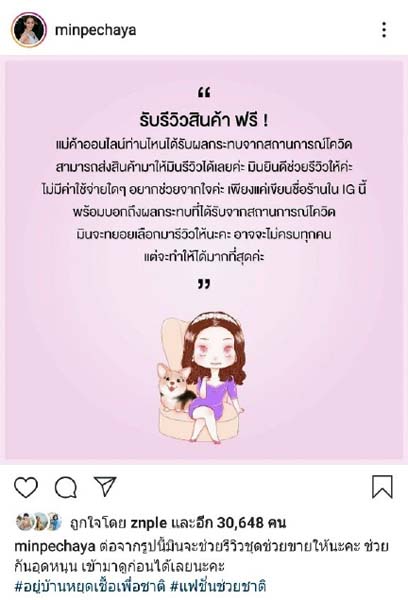 ขณะที่นางเอกสาวมิน-พีชญา วัฒนามนตรี ก็เปิดบ้านเป็นสตูดิโอถ่ายแฟชั่น รับรีวิวสินค้าให้ฟรี แถมโปรโมทผ่านอินสตาแกรมส่วนตัว เพื่อช่วยพ่อค้า-แม่ค้าออนไลน์ด้วย