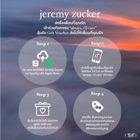 ติดตามความเคลื่อนไหวของ Jeremy Zuckerได้ที่FACEBOOK | TWITTER | INSTAGRAM ติดตาม Universal Music Thailand ใน Platform ต่างๆ ได้ที่FACEBOOK / INSTAGRAM / TWITTER