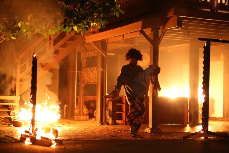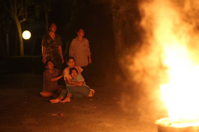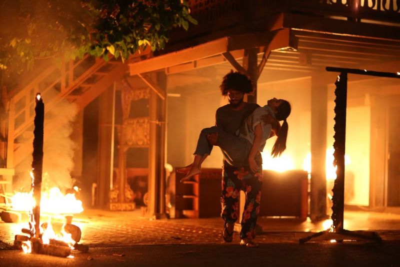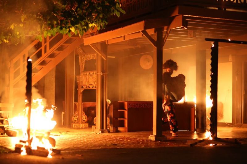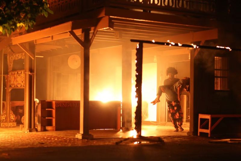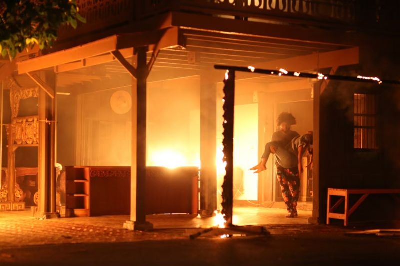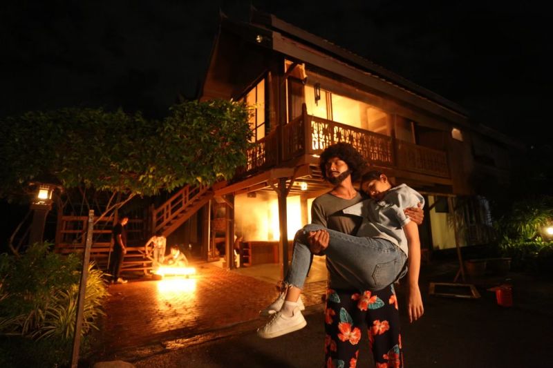 หลังจากซักซ้อมความพร้อมเรียบร้อย ผู้กำกับฯ ก็เดินเครื่องทันที โดยเก็บฉากไฟที่กำลังลุกโหม ในแต่ละจุด จากนั้นเป็นคิวถ่ายทำของ คุณนายสายสมร และ ป้าอิ่ม (ปนัดดา โกมารทัต) กอดคอร้องไห้ เมื่อเห็นไฟกำลังไหม้บ้านพัก และไร่มะละกอ เมื่อเก็บซีนนี้เสร็จแล้วก็ถึงคิว หนุ่มโหน ที่ต้องวิ่งเข้าไปในบ้าน เพื่อช่วยเหลือ จิ้งหรีด โดยต้องย้ายกล้องไปอยู่ในบ้าน เพื่อเก็บมุมของ หนุ่มโหน เมื่อได้ภาพสมใจ ก็ย้ายกล้องมาอยู่ด้านหน้า เพื่อเก็บภาพ หนุ่มโหน อุ้ม สาวมะเหมี่ยว ฝ่ากองเพลิงออกมาจากบ้านแบบแมนสุดๆ โดยมี คุณนายสายสมร, ป้าอิ่มและนักแสดงสมทบ รอรับอยู่ด้านหน้า ซึ่งคนดูจะได้ตื่นเต้นกับฉากนี้แน่นอน!!!