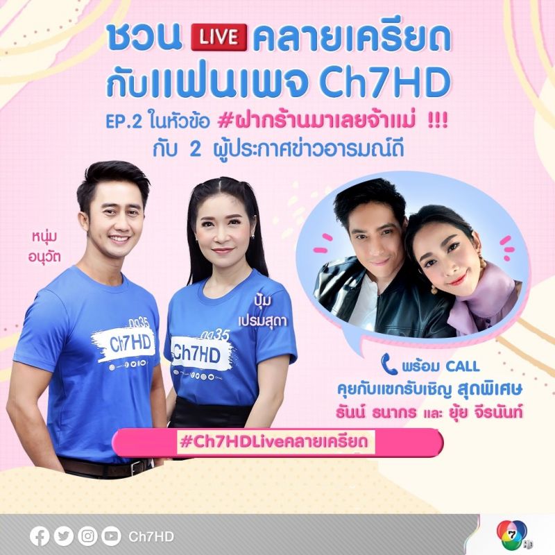 กระแสตอบรับดีสุด ๆ สำหรับรายการออนไลน์โปรเจ็กต์พิเศษ “Ch7HDLive คลายเครียด” ทางFacebook Live Fanpage: Ch7HDที่มียอดวิวพุ่งกระฉูดโดยล่าสุด2 ผู้ประกาศข่าวอารมณ์ดี หนุ่ม-อนุวัต และ ปุ้ม-เปรมสุดายังคงทำหน้าที่พิธีกรชวนแฟน ๆ มาคุยสนุกในหัวข้อ#ฝากร้านมาเลยจ้าแม่กับ ยุ้ย-จีรนันท์ มะโนแจ่ม หรือ ช่อแพร จากละคร ตะวันอาบดาว ที่ควงหวานใจ ธันน์ ธนากร มาไลฟ์สด เปิดบ้านเล่ากิจกรรมยามว่าง ให้แฟน ๆ ได้สัมผัสโหมดหวานพร้อมเผยถึงความรู้สึกช่วงที่ต้องกักตัวอยู่บ้าน จากสถานการณ์ โควิด –19