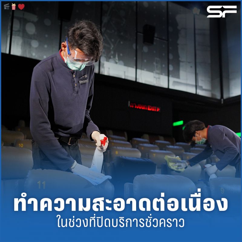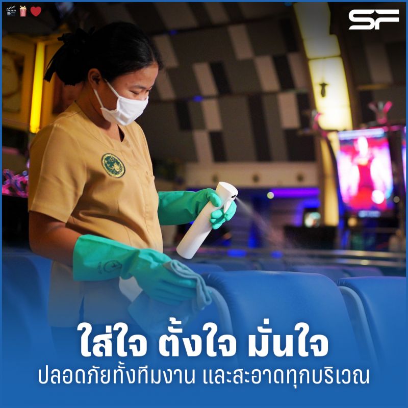ซึ่งโรงภาพยนตร์ในเครือ เอส เอฟ เองนั้น แม้ว่าจะปิดให้บริการโรงภาพยนตร์ชั่วคราว ก็ไม่หยุดดำเนินมาตรการการป้องกันการแพร่ระบาดของเชื้อไวรัส COVID-19 โดยทางโรงภาพยนตร์ได้มีการทำความสะอาดอย่างต่อเนื่องทั้งในภายในโรงภาพยนตร์ และทุกจุดบริเวณโรงภาพยนตร์ด้วยน้ำยาฆ่าเชื้อ พร้อมทั้งมีการดูแลความสะอาดโซฟาและที่นั่งด้วยผลิตภัณฑ์ที่ได้มาตรฐาน นอกจากนี้เพื่อความสะอาดปลอดเชื้อ ทาง เอส เอฟ ได้มีการฉีดพ่นฆ่าเชื้อด้วยผลิตภัณฑ์ที่ได้รับการรับรองจากสถาบันวิจัยชั้นนำทั้งในประเทศและในระดับสากล ปลอดภัยต่อระบบนิเวศน์ สิ่งแวดล้อม และเป็นมิตรกับผู้ใช้ สามารถย่อยสลายได้ตามธรรมชาติมาฉีดพ่นและเช็ดทำความสะอาดที่โรงภาพยนตร์ในเครือ เอส เอฟ อย่างต่อเนื่องเพื่อสร้างความมั่นใจในความสะอาดปลอดเชื้อ