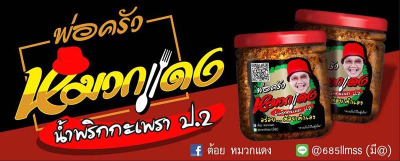 ก็พร้อมลุกขึ้นสู้หารายได้ โดยมีภรรยา ‘มาดามหลี’ คอยบัญชาสั่งการอยู่เบื้องหลัง กับ ‘น้ำพริกกะเพรา ป.2’เน้นๆ เนื้อๆ กับปลาทูคุณภาพดี โดยงานนี้พ่อครัวหมวกแดง ลงครัวตำเอง ผลิตเองทุกขั้นตอน โดย ‘ต้อย หมวกแดง’ เล่าให้ฟังว่า