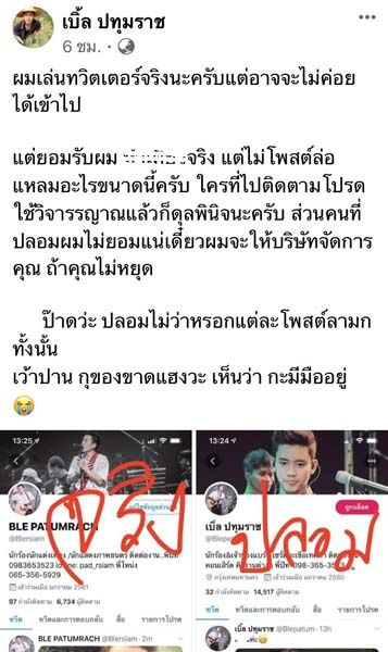 เบิ้ล-ปทุมราช อาร์สยาม กล่าวชี้แจงว่า “ผมเพิ่งสมัครเป็นสมาชิกของทวิตเตอร์ในชื่อ BLE PATUMRACH @Blersiam เมื่อต้นปี 2561 นี่เองครับ แต่ไม่ค่อยได้เข้าโพสต์อะไรเท่าไหร่ ก็เลยมีคนมาแอบอ้าง และสร้างทวิตเตอร์ปลอมเป็นตัวผมมาก่อนผมอีก แถมแต่ละโพสต์ของเค้าก็ลามกทั้งนั้น เลยอยากจะบอกแฟนคลับที่น่ารักของเบิ้ลว่า ผมเล่นทวิตเตอร์@Blersiam อันเดียวนะครับ อันอื่นที่มีผู้ติดตามเยอะกว่าอาจจะเป็นเพราะโพสต์ล่อแหลม แต่ไม่ใช่ตัวผมนะครับ ยังไงฝากติดตามทวิตฯ อันที่ถูกต้องนะครับ ผมจะให้มีคนติดตามขึ้นเยอะๆ เรื่อยๆ แต่อย่าไปดูอันที่ลามก ซึ่งผมอาจจะมีโพสต์บ้างแต่ไม่ถึงขนาดอนาจาร และสำหรับผู้ที่แอบอ้างปลอมทวิตเตอร์ทำให้ผมเสียหาย และแฟนคลับเข้าใจผิดนะครับ ถ้าหากคุณยังไม่หยุด ผมจะให้บริษัทจัดการขั้นเด็ดขาดแน่นอนครับ”