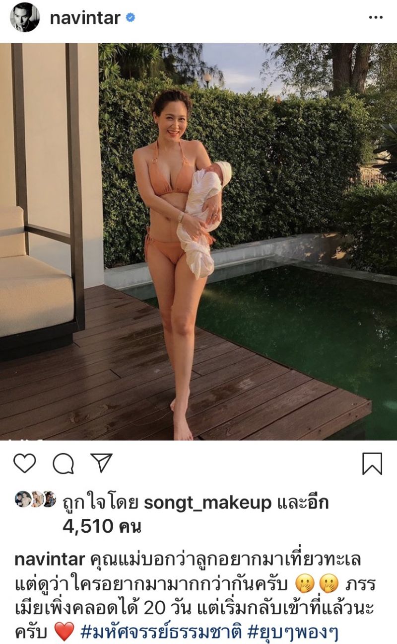 นาวินต้าร์ โพสต์ไอจีส่วนตัวลงรูปภรรเมีย กำลังอุ้มลูกสาว “น้องมาโก้” ในชุดทูพีช อวดหุ่นเป๊ะปัง ทั้งที่เพิ่งคลอดลูกได้เพียง 20 วัน แต่หุ่นของไฮโซน้ำหวาน กลับเข้าที่เร็วมาก ขอความว่า “คุณแม่บอกว่าลูกอยากมาเที่ยวทะเล แต่ดูว่าใครอยากมาเที่ยวมากกว่ากันครับ ภรรเมียเพิ่งคลอดลูกได้ 20 วัน แต่เริ่มเข้าที่แล้วนะครับ #มหัศจรรย์ธรรมชาติ #ยุบๆพองๆ” ทำเอาโลกโซเชียลฮือฮา