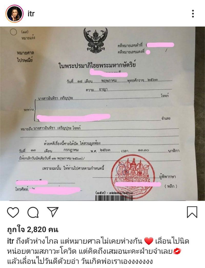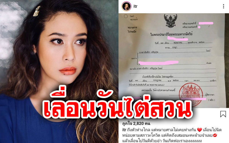 ล่าสุด เจ้าตัวก็ได้โพสต์ภาพหมายศาล พร้อมบอกว่าเนื่องจากที่ผ่านมาติดในช่วง โควิด-19 ทำให้ต้องเลื่อนวันในการไต่สวนมูลฟ้องไปเป็นวันที่ 13 ก.ค.2563 นอกจากนี้เธอยังเขียนแคปชั่นว่า “ถึงตัวห่างไกล แต่หมายศาลไม่เคยห่างกัน เลื่อนไปนิดหน่อยตามสภาวะโควิด แต่คิดถึงเสมอนะคะฝ่ายจำเลย แล้วเลื่อนไปวันดีด้วยอ่า วันเกิดพ่อเราเองงงงงงง”