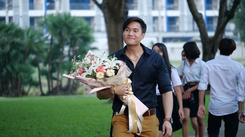 ส่วนอีกซีนมีหมู่มวลเข้าฉากพร้อมหน้า ทั้ง อ้อม, วิน และใบหม่อน มาในชุดนักศึกษา ในขณะที่กำลังเดินคุยกันมาอย่างสนุกสนาน เมฆ, บิว และ เปรี้ยว ก็เห็น ม้วน เดินเข้ามาหา พร้อมดอกไม้ช่อโต และคำกล่าวขอโทษ เพื่อให้เปรี้ยว ใจอ่อนและยอมคืนดี แต่เพื่อนรักอย่าง บิว รีบกันท่า ชิงเอาดอกไม้ปาทิ้งลงพื้น พร้อมคำกล่าวที่ไม่มีวันให้อภัย ส่วน เมฆ ก็ใช้ความแมนปะทะกับ ม้วน ตรงๆ ทำเอา ม้วน ถึงกับถอย จากนั้นก็ถึงคิว กอบกุล ที่ตามมาสมทบ และตั้งการ์ดไม่ให้ ม้วน เข้ามาใกล้ เปรี้ยว อีกเด็ดขาด “เพื่อนข้า...ใครอย่าแตะ”