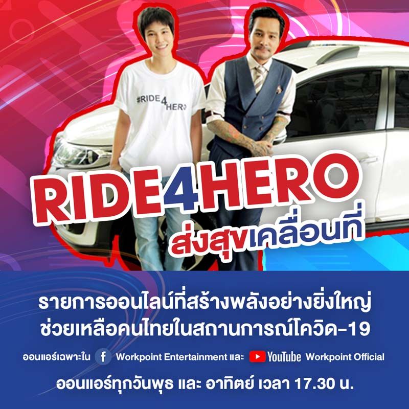 ด้วยสถานการณ์โควิด – 19 ที่ทำให้ประชาชนคนไทยทุกคนเกิดความทุกข์ บริษัทฮอนด้า บ้านใหม่ ปทุมธานี โดย คุณนนท์ – ธนน วีอารยะ ประธานกรรมการ และ เจ้าของโครงการ #RIDE4HERO ร่วมกับ สื่อออนไลน์ของ Workpoint Entertainment ได้จับมือร่วมกันทำรายการพิเศษเพื่อบรรเทาความทุกข์นี้จากพี่น้องคนไทยที่ได้รับผลกระทบจากโควิด – 19 กับรายการ “RIDE4HERO ส่งสุขเคลื่อนที่” โดยได้ หมอเจี๊ยบ – ลลนา ก้องธรนินทร์ มาเป็นพิธีกรหลักของรายการ