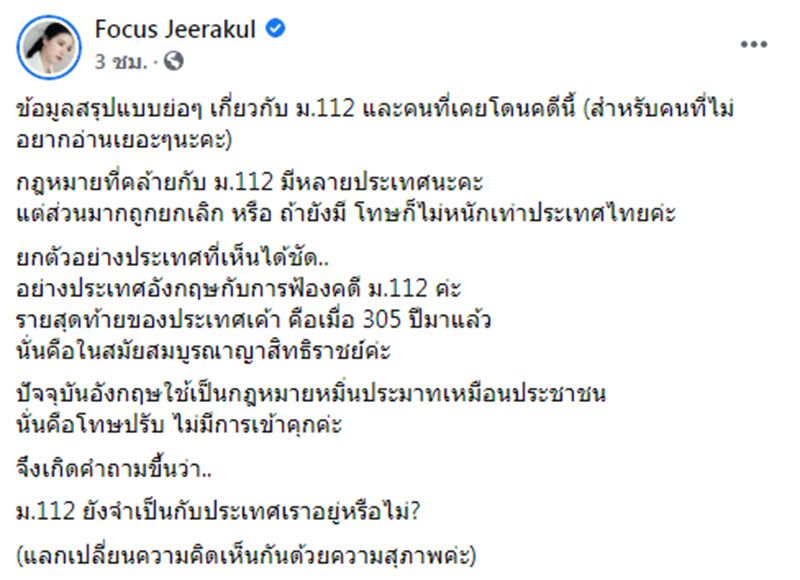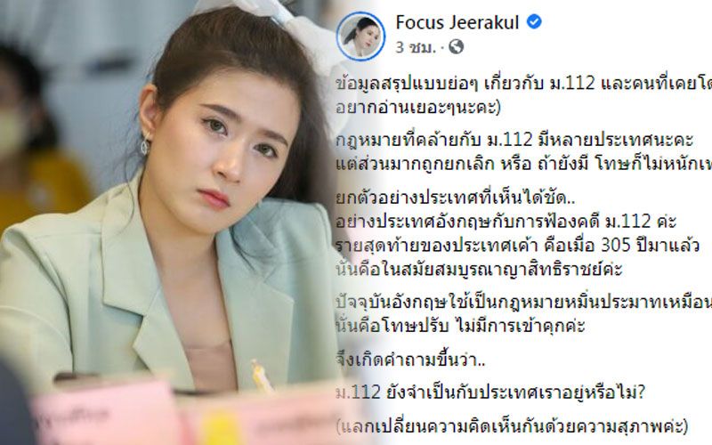 วันที่ 11 ธันวาคม 2563 น.ส.โฟกัส จีระกุล นักแสดง เกมเมอร์ชื่อดัง โพสต์ข้อความระบุว่า ข้อมูลสรุปแบบย่อๆ เกี่ยวกับ ม.112 และคนที่เคยโดนคดีนี้ (สำหรับคนที่ไม่อยากอ่านเยอะๆนะคะ)