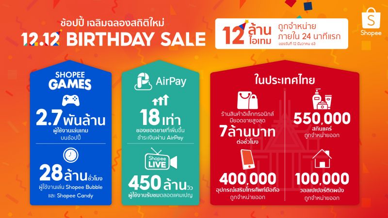 สำหรับมหกรรม Shopee 12.12 Birthday Sale ในครั้งนี้ ได้รับการตอบรับที่ดีจากนักช้อปทั่วทั้งภูมิภาคโดยช้อปปี้ได้ทำลายทุกสถิติในวันที่ 12 ธันวาคม ที่ผ่านมา ด้วยยอดจำหน่ายสินค้าสูงถึง12 ล้านชิ้น ในเวลาเพียง 24 นาทีแรก และช่วงที่พีคที่สุดสามารถจำหน่ายสินค้าออกไปได้ถึง 1 ล้านชิ้นภายใน 1 นาที ในขณะที่นักช้อปชาวไทยนับล้านตบเท้าเข้าร่วมแคมเปญฉลองวันเกิด และเพลิดเพลินไปกับการจับจ่ายซื้อสินค้าในหลากหลายหมวดหมู่กับช้อปปี้ อาทิ สกินแคร์ 550,000 ชิ้น อุปกรณ์เสริมโทรศัพท์มือถือ 400,000 ชิ้น และวอลเปเปอร์ติดผนัง 100,000 ชิ้น