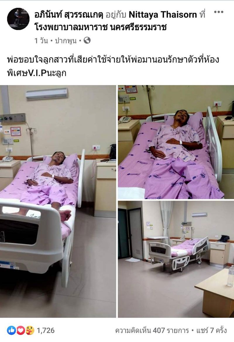 คุณพ่ออภินันท์ ยังได้โพสต์ภาพตัวเองขณะนอนอยู่บนเตียง พร้อมข้อความสุดซึ้งว่า "พ่อขอบใจลูกสาวที่เสียค่าใช้จ่ายให้พ่อมานอนรักษาตัวที่ห้องพิเศษ VIP นะลูก"