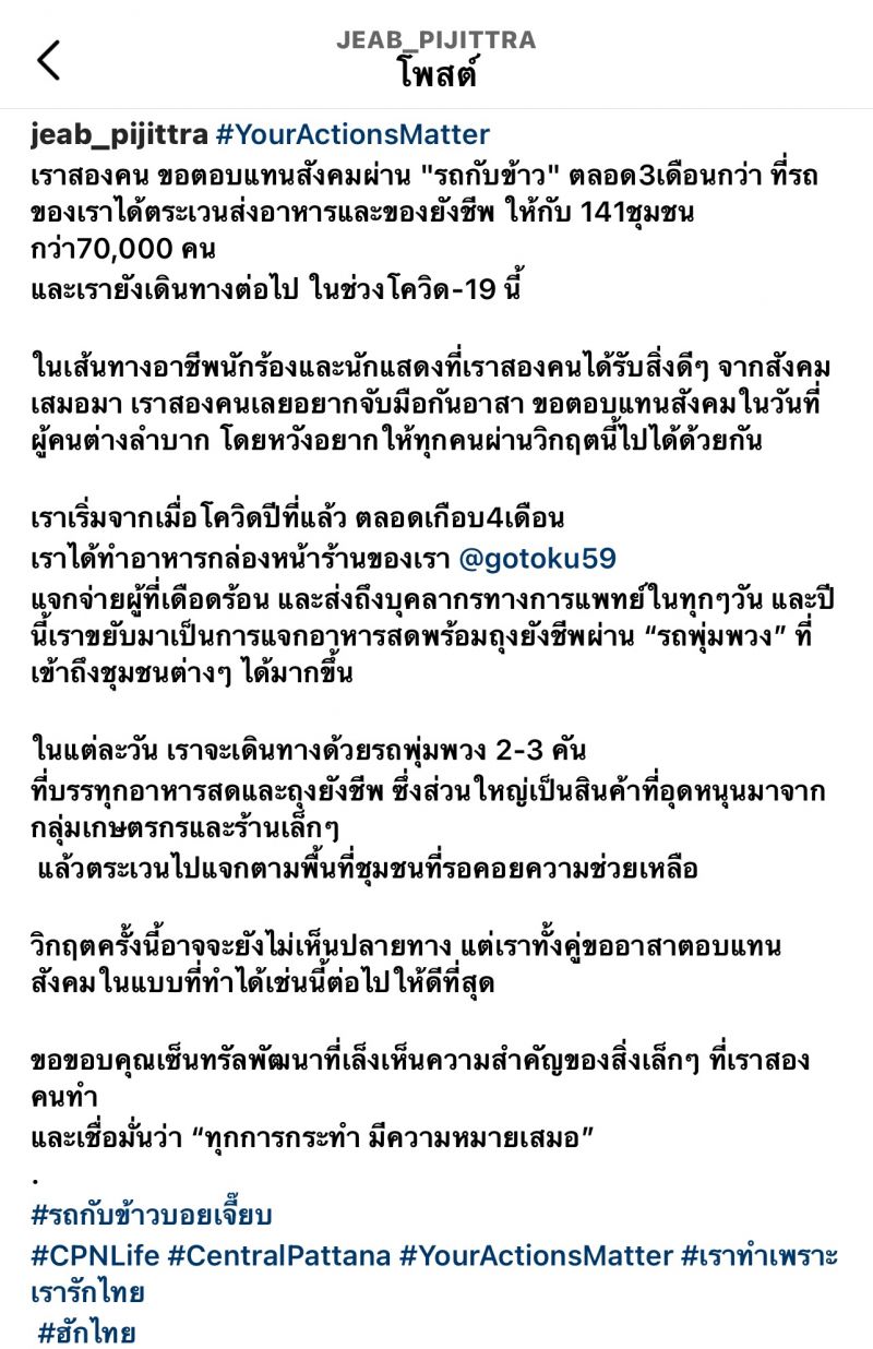 ในแต่ละวัน เราจะเดินทางด้วยรถพุ่มพวง 2-3 คัน ที่บรรทุกอาหารสดและถุงยังชีพ ซึ่งส่วนใหญ่เป็นสินค้าที่อุดหนุนมาจากกลุ่มเกษตรกรและร้านเล็กๆ แล้วตระเวนไปแจกตามพื้นที่ชุมชนที่รอคอยความช่วยเหลือ วิกฤตครั้งนี้อาจจะยังไม่เห็นปลายทาง แต่เราทั้งคู่ขออาสาตอบแทนสังคมในแบบที่ทำได้เช่นนี้ต่อไปให้ดีที่สุดขอขอบคุณเซ็นทรัลพัฒนาที่เล็งเห็นความสำคัญของสิ่งเล็กๆ ที่เราสองคนทำ และเชื่อมั่นว่า “ทุกการกระทำ มีความหมายเสมอ” #รถกับข้าวบอยเจี๊ยบ #CPNLife #CentralPattana #YourActionsMatter #เราทำเพราะเรารักไทย #ฮักไทย