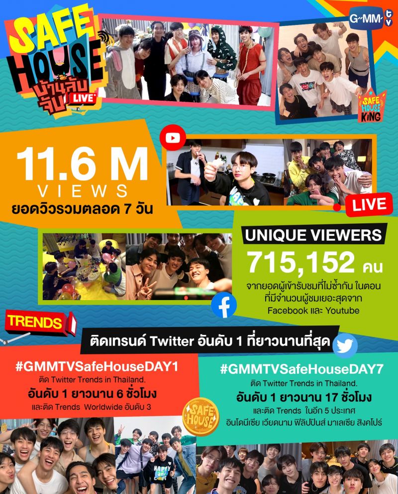 จบไปแล้วสำหรับปรากฏการณ์ความฟินครั้งใหญ่ REALITY LIVE SHOW ของ “GMMTV” ผู้นำด้านคอนเทนต์วัยรุ่นแบบครบวงจร ที่ได้รับกระแสตอบรับในโลกออนไลน์อย่างถล่มทลาย และถูกพูดถึงจากแฟนคลับเป็นจำนวนมาก กับรายการสุดฟินกระแสปัง “SAFE HOUSE บ้านลับ จับ LIVE” ส่องกันทั้งวัน ทั้งคืน ทั้งบ้าน โดย LIVE สด ตลอด 7 วันเต็ม ให้แฟนๆ ได้ชมกันแบบจุใจ และกระแสความร้อนแรงยังคงพุ่งต่อเนื่องไม่มีแผ่วตั้งแต่วันแรก ส่งแฮชแท็ก#GMMTVSafeHouseDAY1 ติดเทรนด์“อันดับ 1”ใน Twitter ประเทศไทยยาวนาน 6 ชั่วโมง ติดเทรนด์Worldwideสูงสุด “อันดับ 3”และติดเทรนด์ใน 3 ประเทศ ได้แก่ อินโดนีเซีย, เวียดนาม, ฟิลิปปินส์ จนถึงวันสุดท้ายของการไลฟ์ก็สร้างกระแสความฟิน กระหึ่มโซเชียลทั่วโลก ดันแฮชแท็ก#GMMTVSafeHouseDAY7พุ่งทะยานติดเทรนด์ความนิยม “อันดับ 1”ใน Twitterประเทศไทยยาวนาน 17 ชั่วโมง รวมถึงติดเทรนด์ทวิตเตอร์ใน 5 ประเทศอีกด้วย ได้แก่ อินโดนีเซีย, เวียดนาม, ฟิลิปปินส์, มาเลเซีย, สิงคโปร์ และยังสร้างสถิติยอดผู้ชมไลฟ์พร้อมกัน ทาง Facebookและ YouTube เกือบ 1 ล้านคนต่อวัน รวมยอดวิวตลอด 7 วันเป็นจำนวนถึง 11.6 ล้านวิว