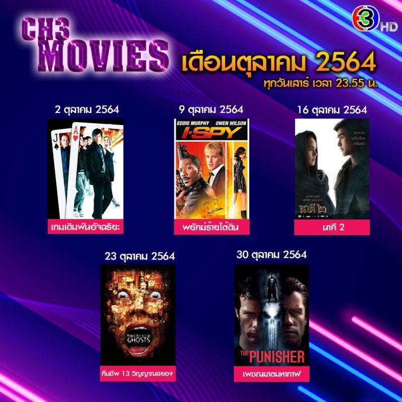 มาถึงแชนแนล ทรี มูฟวี่ส์ เดือนตุลาคมกับภาพยนตร์วันเสาร์เวลา 23.55-02.15 น.รับชมหนังดังที่จัดความบันเทิงมาให้เต็มรูปแบบเพื่อความสุขของคนนอนดึกทั้งหนังไทยและหนังฝรั่งเรื่องยาวเริ่มวันเสาร์ที่ 2ตุลาคม2564เรื่อง“21 เกมเดิมพันอัจฉริยะ”เรื่องของ เบน แคมป์เบลนักศึกษา M.I.T. ขี้อายแต่ฉลาดเพื่อจะให้มีค่าเทอมจึงต้องเดินทางเข้าสู่บ่อนพนันลาสเวกัสที่น่ากลัวและท้าทายต่อชีวิตนำแสดงโดย : จิม สเตอร์เกส, เควิน สเปซีย์, เคท บอสเวิร์ธ, ลอว์เรนซ์ ฟิชเบิร์นวันเสาร์ที่ 9ตุลาคม 2564“I Spy”พยัคฆ์ร้ายใต้ดินเมื่อเจ้าหน้าที่พิเศษและแชมป์เปี้ยนมวยโลกรุ่นมิดเดิลเวท จับคู่ท้าตายชิงสุดยอดเทคโนโลยีเครื่องบินสอดแนมลำล่าสุดของรัฐบาลสหรัฐฯ ที่อยู่ในเงื้อมือของจอมวายร้ายพ่อค้าอาวุธภาระกิจนี้จึงไม่ได้ง่ายอย่างที่คิด นำแสดงโดย : โอเว่น วิลสัน, เอ็ดดี้ เมอร์ฟีย์, มัลคอล์ม แม็คดูเวลล์, เจย์ บารูเซลวันเสาร์ที่ 16 ตุลาคม2564“ภาพยนตร์ไทยเรื่อง นาคี 2” เรื่องราวของสร้อย สาวดอนไม้ป่าผู้เติบโตมาพร้อมกับความเชื่อและศรัทธาเจ้าแม่นาคีกับคดีสะเทือนขวัญลี้ลับมากมายที่รอคอยให้ไขปริศนานำแสดงโดย : อุรัสยา เสปอร์บันด์, ณเดชน์ คูกิมิยะ, ณฐพร เตมีรักษ์, ภูภูมิ พงศ์ภาณุภาควันเสาร์ที่ 23 ตุลาคม2564“13 Ghosts”คืนชีพ 13 วิญญาณสยองบ้านหลังใหม่ของครอบครัวที่เพิ่งได้รับมรดกมา ช่างสะอาดและสวยงามแต่ใครเลยจะรู้ว่าภายในบ้านหลังนี้มีความลับดำมืดซ่อนอยู่เพื่อรอวันให้พวกเขาเผชิญนำแสดงโดย: โทนี ชาลู, แชนนอน เอลิซาเบธ, อเล็ค โรเบิร์ตส์, เอ็มเบ็ธ ดาวิดทซ์และวันเสาร์ที่ 30 ตุลาคม 2564“The Punisher”เพชฌฆาตมหากาฬปฏิบัติการล้างแค้นสุดหฤโหดของแฟรงค์ คาสเทิลเจ้าหน้าที่พิเศษเอฟบีไอ และชะตากรรมของพวกเหล่าทรชนแก๊งมาเฟียจอมโหดที่จะต้องถูกตัดสินในแบบศาลเตี้ย นำแสดงโดย: โธมัส เจน, จอห์น ทราโวลต้า, ลอร่า ฮาร์ริ่ง