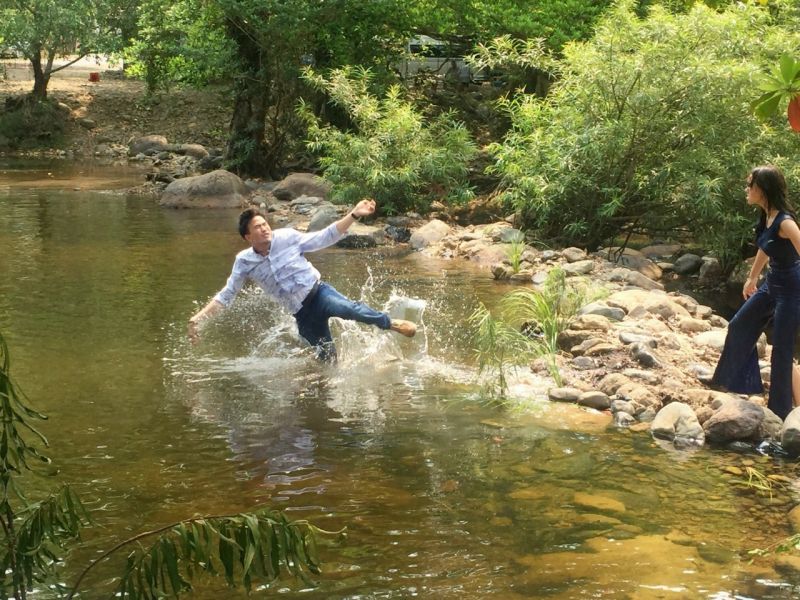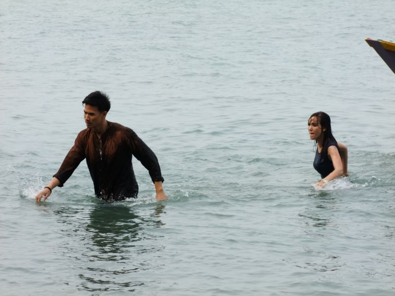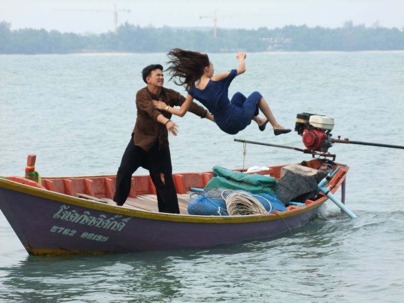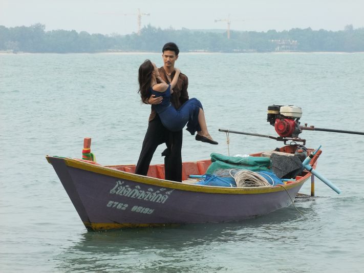 แจ็คกี้ ชาเคอลีน เม้าท์ถึงเบื้องหลังฉากนี้ว่า “ฉากนั้นที่ถ่ายคือเปียกแห้งเปียกแห้งประมาณ 5-6 รอบ หน้าเปื่อย ผมเปื่อยไปหมด นั่นคือฉากแรกของการถ่ายทำ พอพูดแล้วคิดถึงอาต้องปากุญแจลงน้ำตก ต้องตกน้ำ และต้องวิ่งตลอดตอนที่อยู่บนรถกระบะก็ลำบากต้องมานั่งทาตัวแดง ต้องโดนพระเอกฉุดกระชากลากถู ต่อให้ไปถึงเกาะแล้วเราก็หาหนทางหนีตลอดเวลา พายเรือเองบ้าง ขับเรือเองบ้าง ซึ่งแจ็คกี้ขับเรือไม่เป็นแล้วเขาก็ไม่สอนนะ เขาบอกแค่วิธีการสตาร์ทเรือ เขาบอกว่าต้องการความขับเรือไม่เป็นแบบนี้แหละ เราก็ขับไปเลย ขับเป็นวงกลมบ้าง ขับเอียงซ้ายเอียงขาบ้าง บอกเลยสนุกสนานสุดๆเวลาเราถ่ายแล้วมีคนเดินผ่านหน้ากล้อง อาก็จะตะโกนผ่านวอมาว่าเห็นคน! ตั้งรำปืนเลยเห็นใครโผล่ออกมาเตรียมยิงแล้วนะรอบนี้ คืออาแกจะมีความโหดที่น่ารัก”