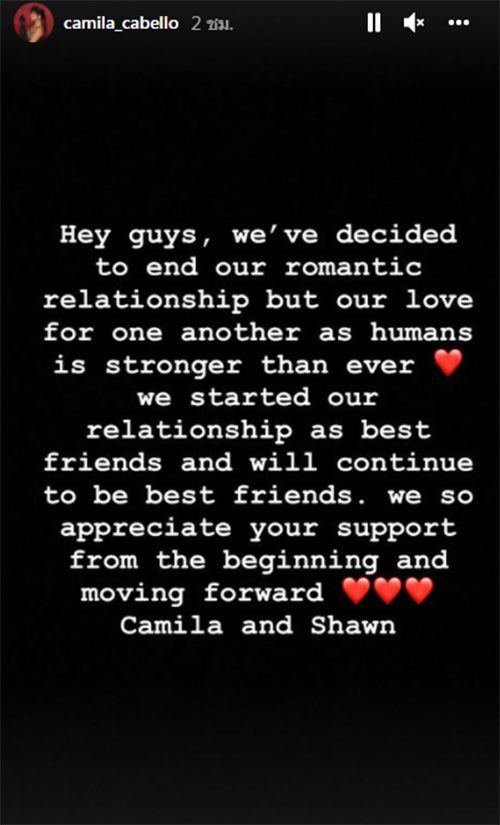 “สวัสดีทุกคน ! พวกเราตัดสินใจแล้วที่จะจบความสัมพันธ์แบบคนรัก แต่ความรักของพวกเราในฐานะเพื่อนมนุษย์จะแข็งแกร่งกว่าที่ผ่านมา เราเริ่มความสัมพันธ์ในฐานะเพื่อนที่สนิทต่อกันและจะเป็นเพื่อนรักกันต่อไปเราขอขอบคุณทุกการสนับสนุนที่ให้กันตั้งแต่แรกและเริ่มต้นเดินหน้าต่อไป คามิลล่าและชอว์น”